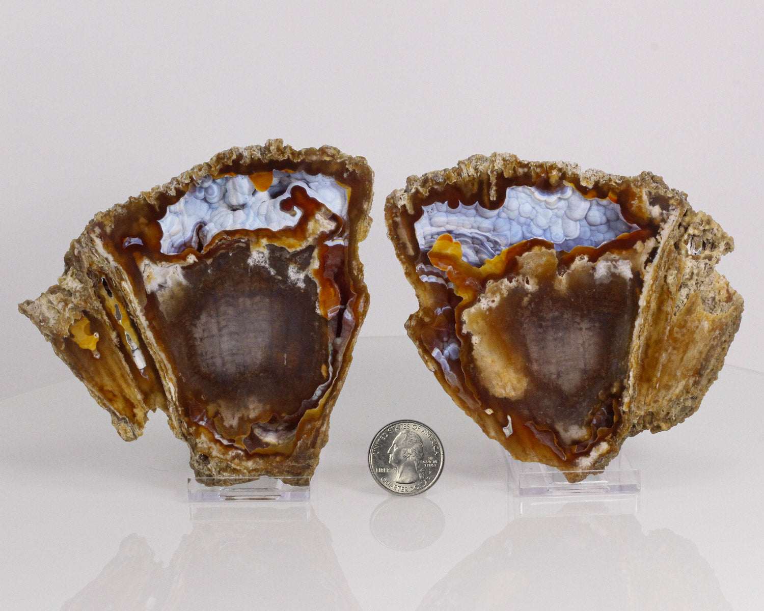 A very aesthetic and beautiful matched pair of coral halves that have been pseudomorphed by Chalcedony/Agate. Chalcedony, in this rounded, banded form, is referred to as Agate. This piece was sawn in half and the faces polished, displaying the brown, banded Agate lining and the white to blue and amber-brown botryoidal interior. This piece is from the Withlacoochee River, FL and happens to be the Florida state stone. A unique and exceptional piece in excellent condition.