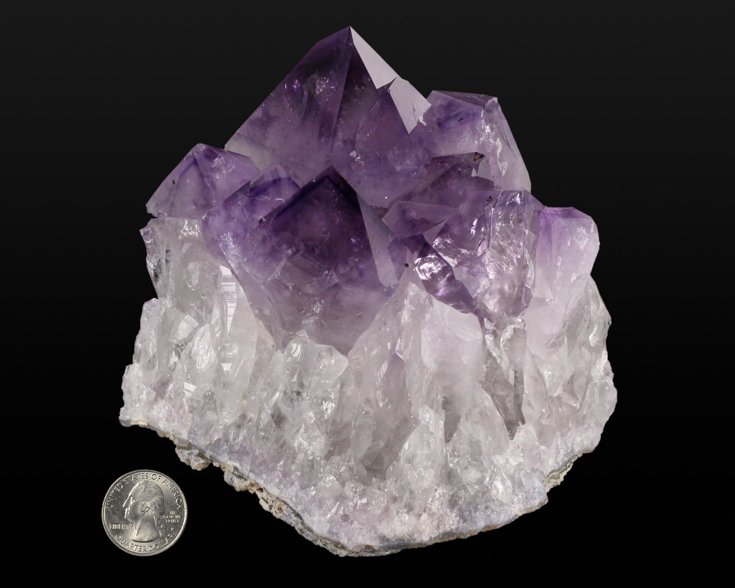 This is an oversized plate of unusually large, transparent, gemmy Amethyst crystals emanating from a base of colorless, highly translucent Quartz. The Amethyst crystals have incredible luster and color, and all of the terminations are pristine. Exceptional color, crystal formation/termination and contrast. In excellent condition.