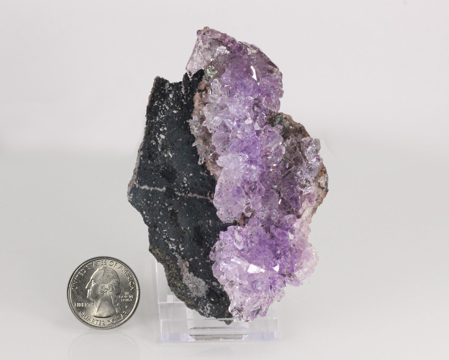 This aesthetic piece features a large cluster of intersecting and intergrown, gemmy, lustrous and colorful miniature Amethyst Quartz scepters positioned on the right side of a dark, contrasting matrix. The two contrasting halves are striking. Outstanding color and luster; a beautiful piece of Tamil Amethyst! In excellent condition.