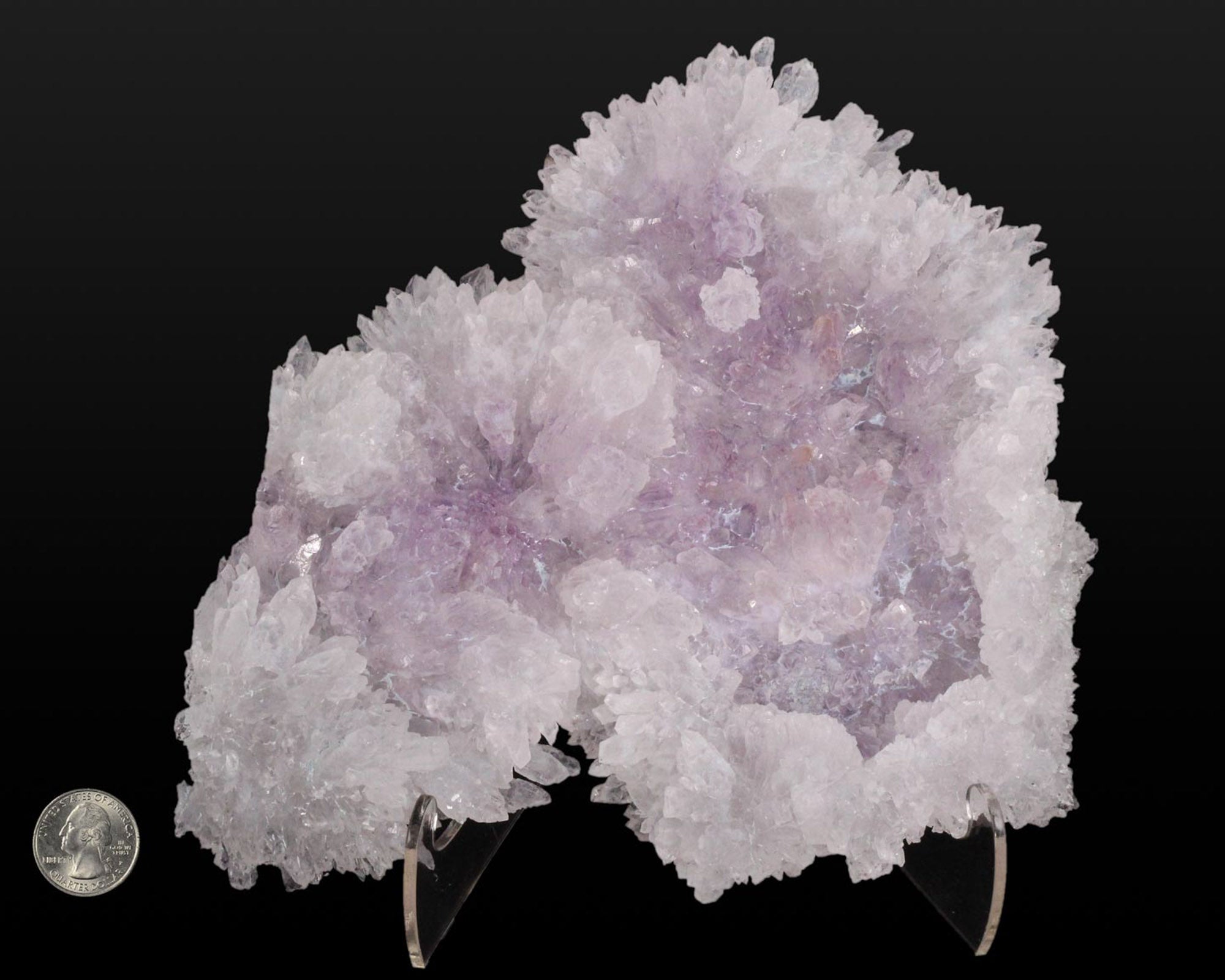 A very large and lustrous specimen featuring two interconnected Amethyst flowers. The Amethyst crystals are transparent to translucent, lustrous, well formed and radiate outwards, creating the “flower” effect. In addition, the color in each flower progresses from purple in the center to colorless on the perimeter creating a beautiful contrast. A striking and aesthetic piece in excellent condition.