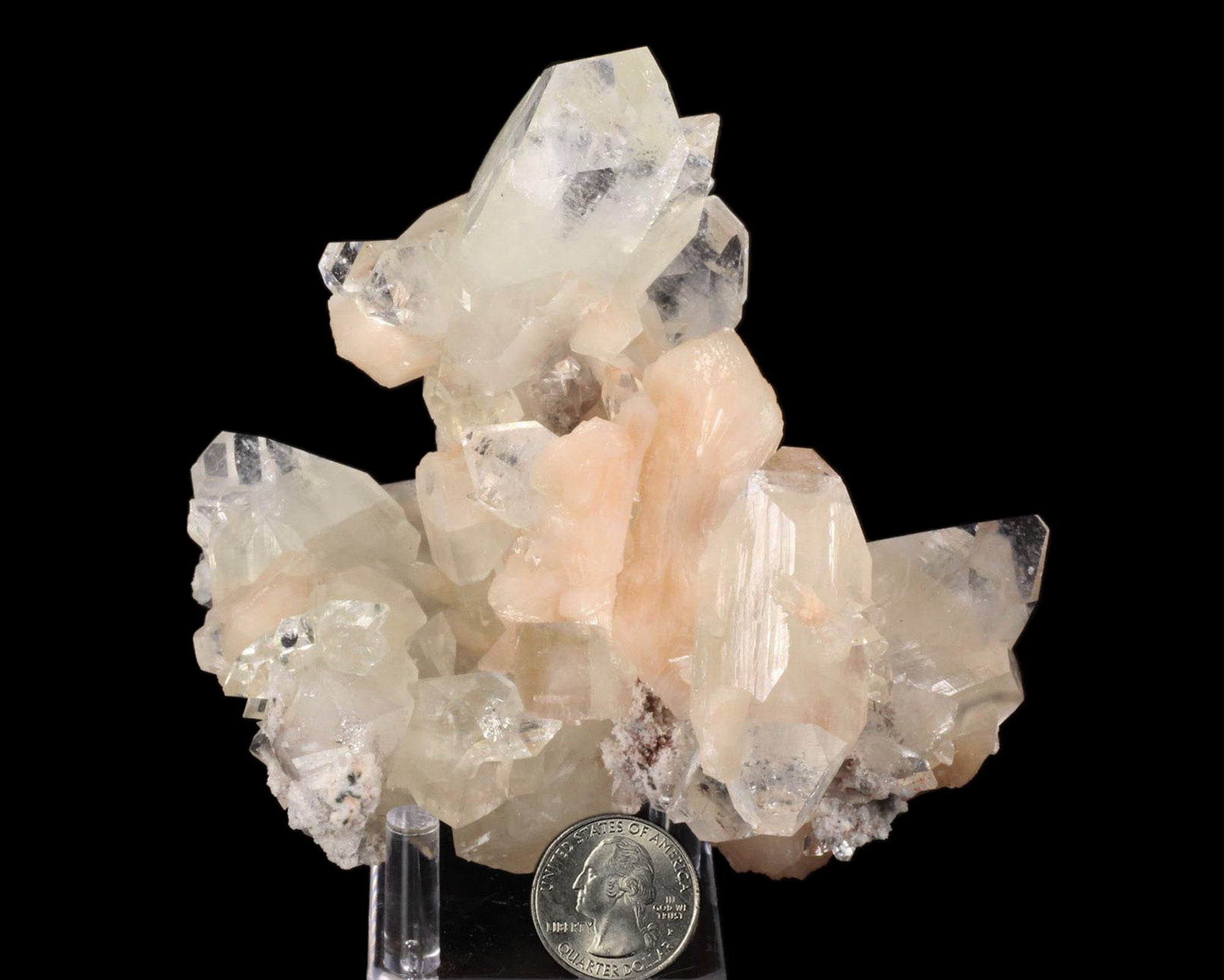 This is not your typical Apophyllite and Stilbite piece out of India - the Apophyllite crystals are clear, gemmy and perfectly terminated and the Stilbite crystals are a light salmon color with a pearl luster. The overall piece is so lustrous it looks wet! A very nice, well balanced piece, no damage.