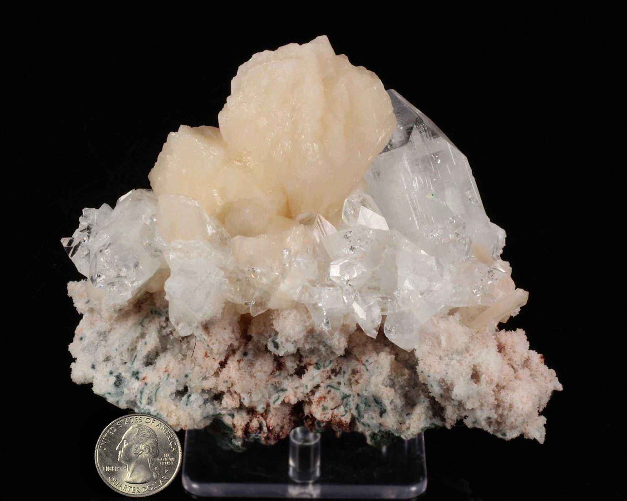 There are countless Zeolites out there, but not many that have this combination and perfection. With two pristine Stilbite crystals sitting centered next to a flawless, large, transparent water-clear pyramidal Apophyllite crystal on top of numerous smaller gemmy Stilbite crystals all on a contrasting matrix, you now have a Ziolite that’s worth having in your collection! A beautiful specimen with no damage.