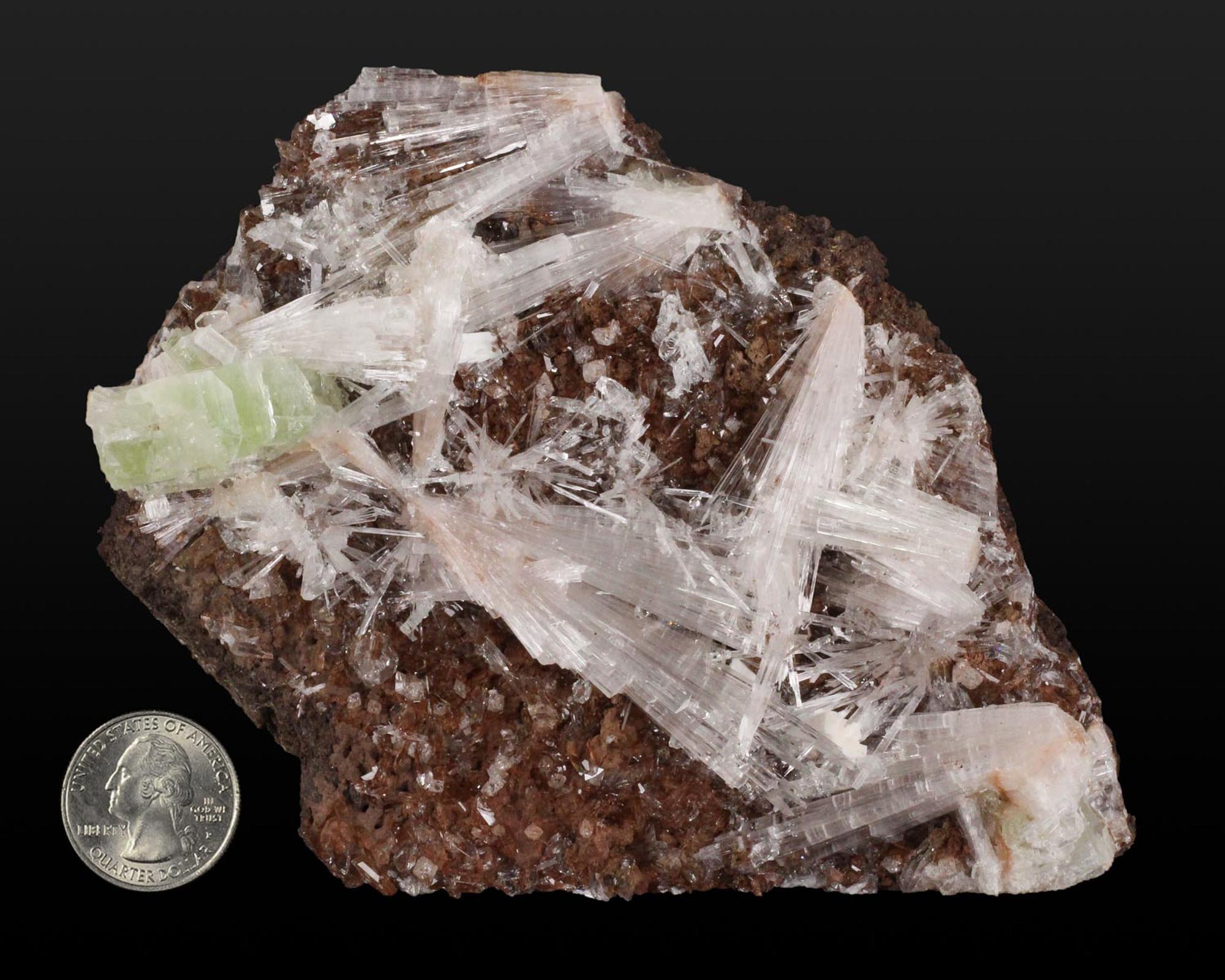 A very aesthetic combination piece featuring a dark-brown matrix hosting numerous acicular sprays of colorless to white, satiny Scolecite, along with a large, lustrous, green modified Apophyllite cube and minor Stilbite. Great contrast and crystal formation - in excellent condition.