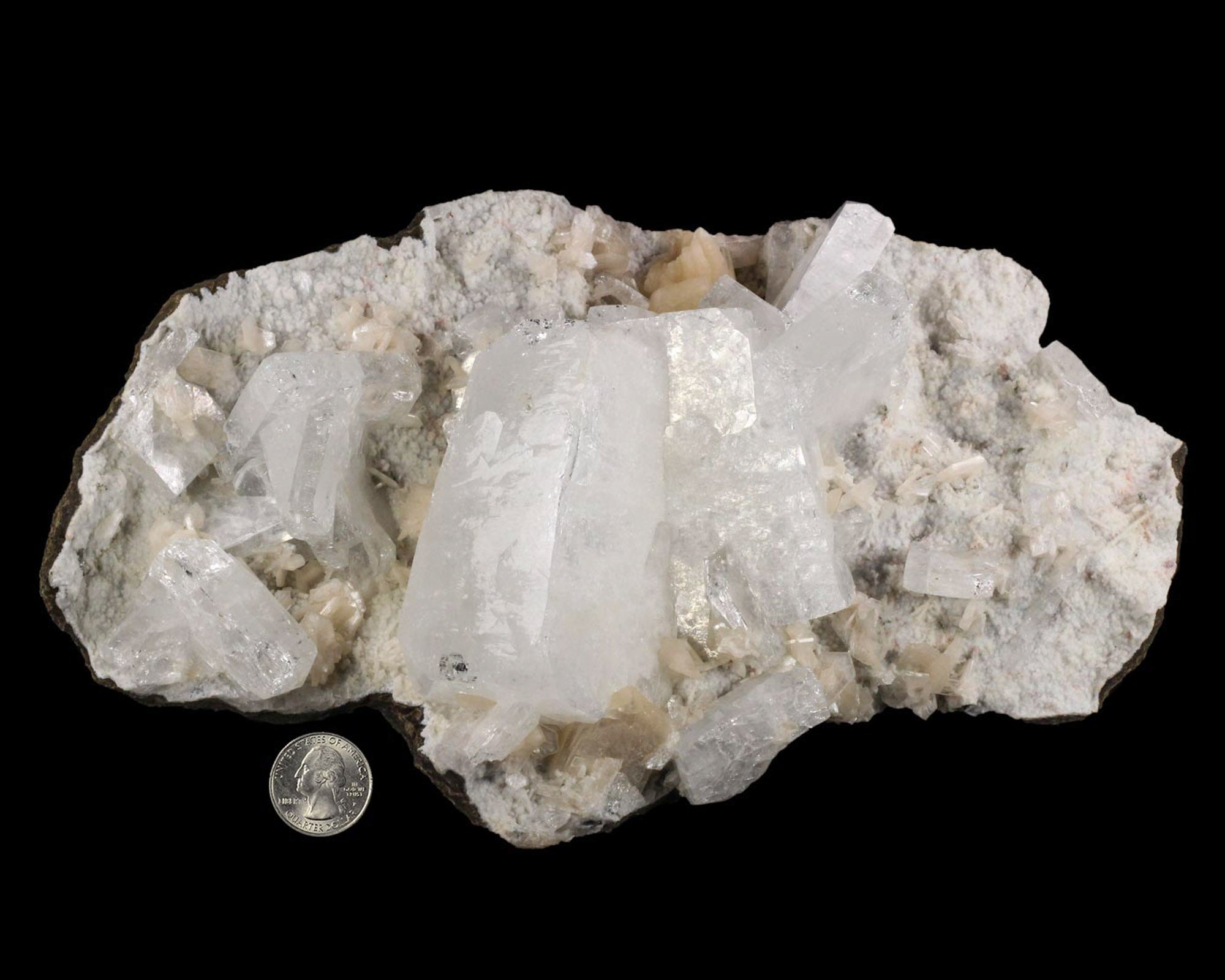 This is a huge plate at 27 x 17 cm. The Apophyllite is presented in both large, rectangular crystals with modified corners as well as tabular crystals. The large rectangular crystals are colorless, lustrous and transparent to translucent and the tabular crystals are colorless, transparent and gemmy. The Apophyllite crystals are incredibly sharp and well formed and many are intergrown. In addition to the Apophyllite crystals are numerous lustrous, well formed peach-colored Stilbite crystals. All of this on a bed of microcrystalline snow-white Quartz. A superb specimen in excellent condition.