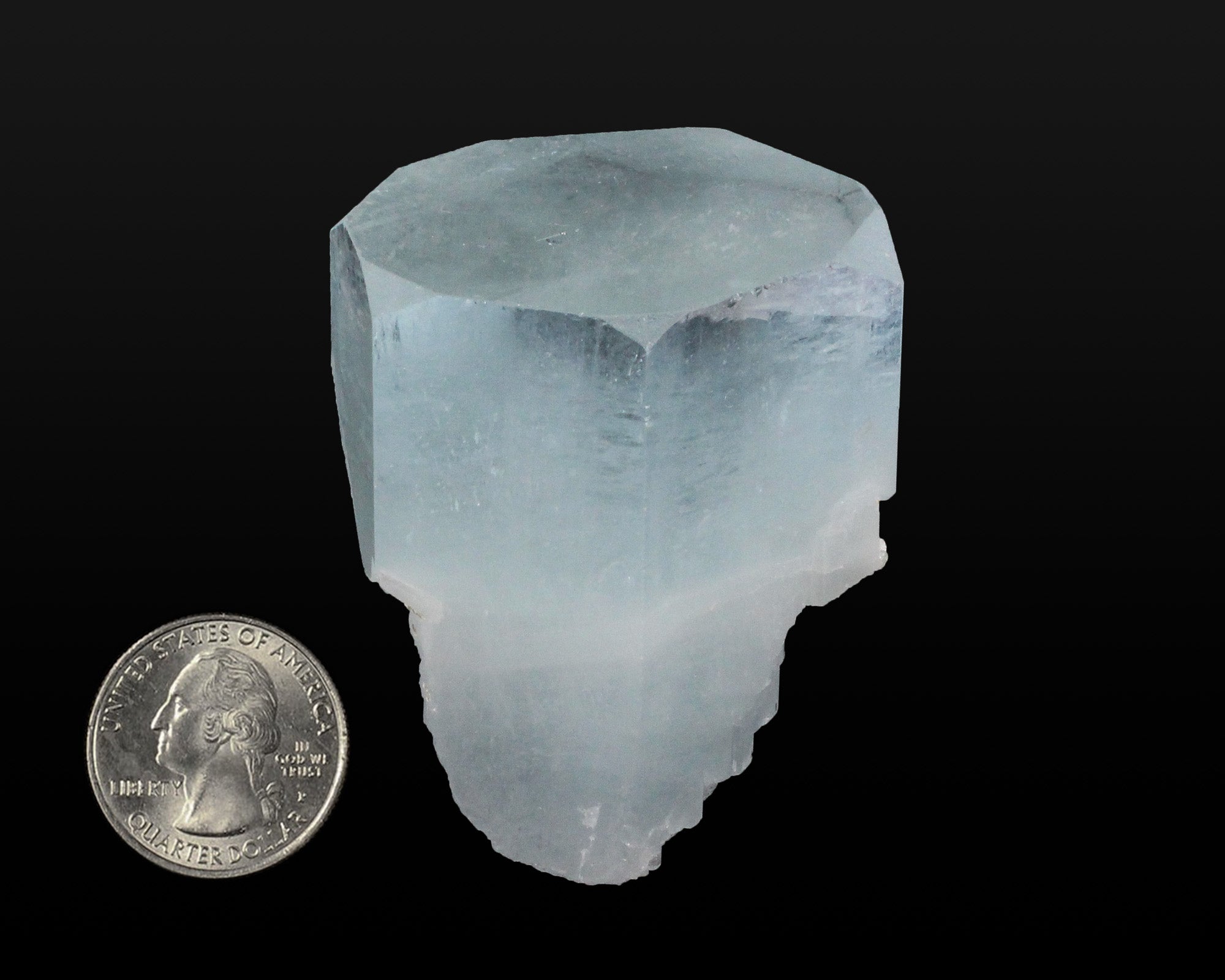 An very large, transparent to translucent, sharp, soft-blue crystal of Aquamarine. The Aquamarine crystal has a flat termination with secondary corner faces and a mirror-like luster. A superb specimen. A superb and very aesthetic specimen with amazing luster, color and crystal formation. In excellent condition.