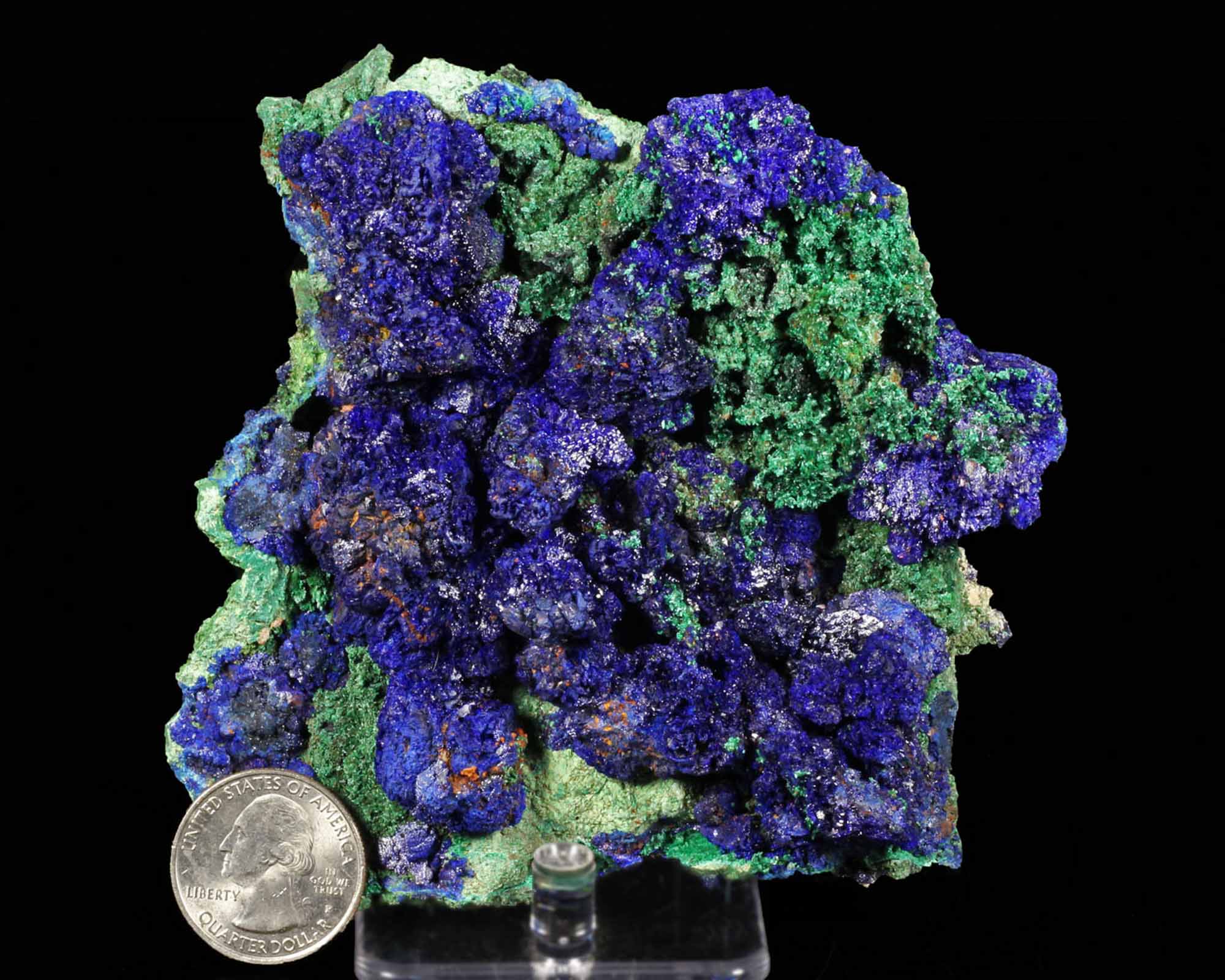 This is a large and stunning piece - multiple rosettes (crystal aggregates) of deep blue Azurite clusters set on a background of rich green Malachite, making for an incredibly aesthetic piece that is not only unusual and rare, but striking in its appearance. I know you’ve read it before on other sites, but I admit it’s true for this piece: the pictures are really quite good, but you simply have to see it in person to really appreciate the beauty of this piece. No damage.