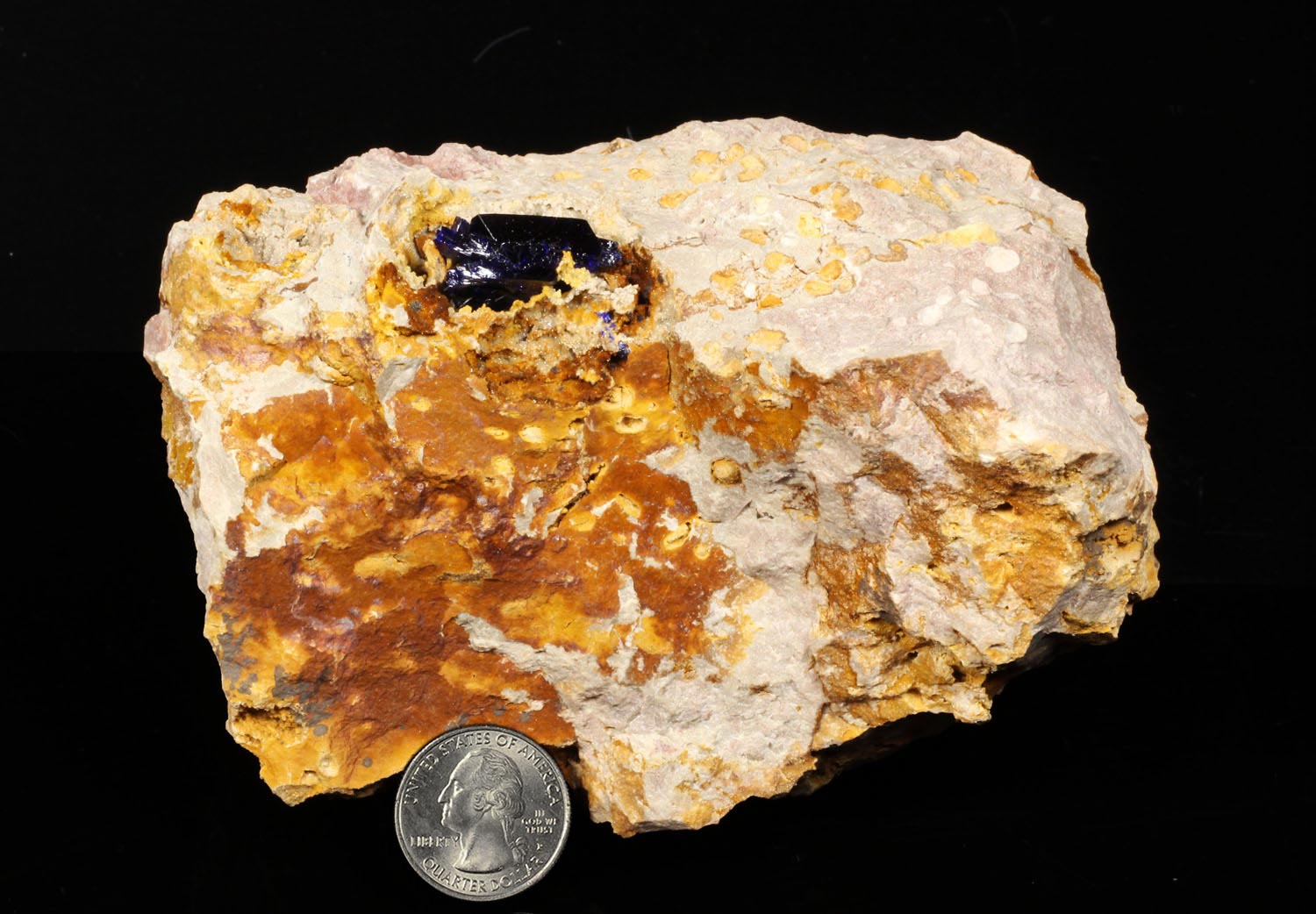 This is a really interesting piece. This has a single, large, well formed beautiful complete Azurite crystal sitting all by itself on a sandstone matrix. The contrast really sets it apart. The crystal is a translucent deep blue as seen by the backlit pic.