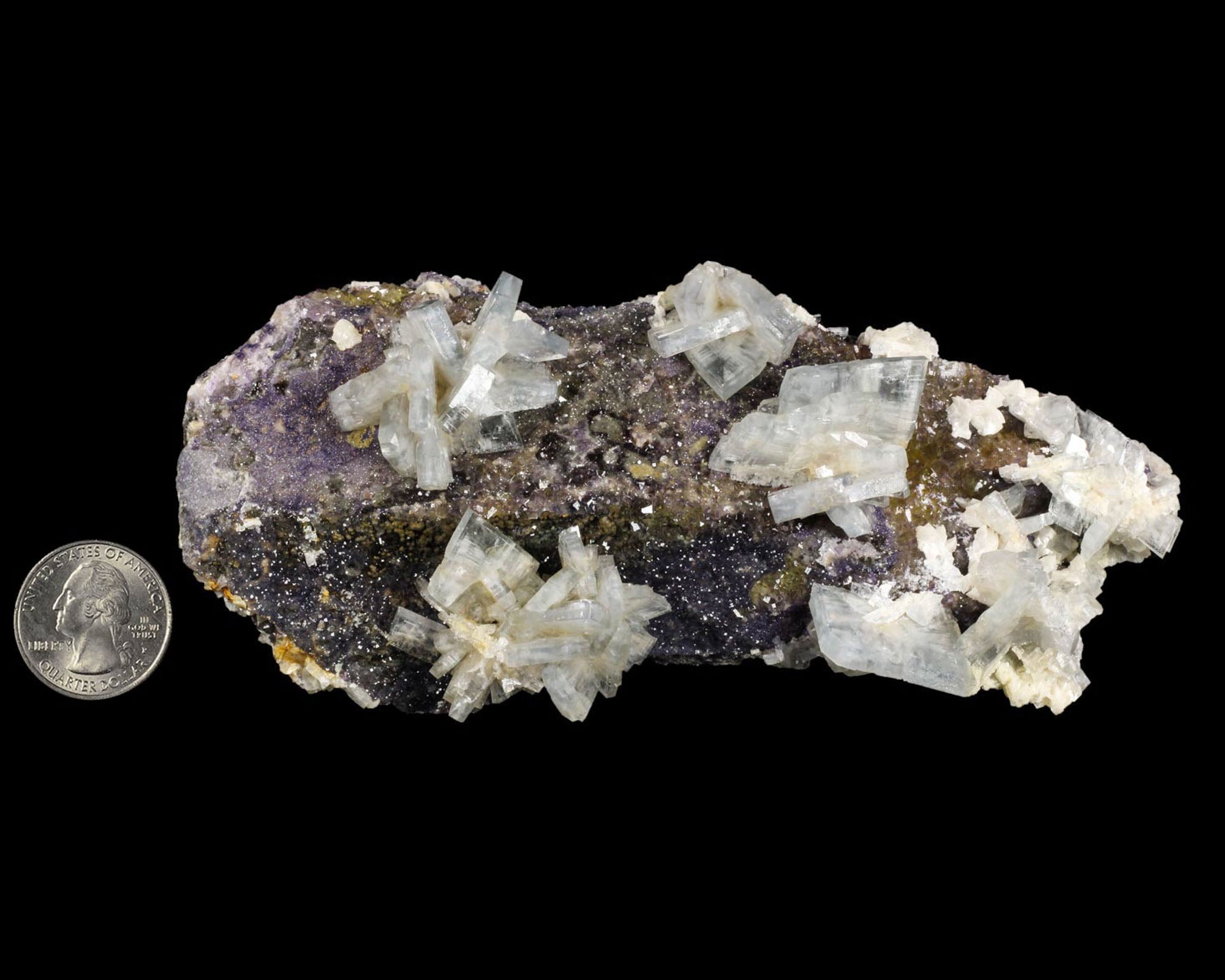 A large piece hosting numerous tabular crystals of transparent to translucent blue-gray Barite on a matrix with miniature Calcite crystals and microcrystalline purple Fluorite. Great contrast, luster and symmetry. In excellent condition.