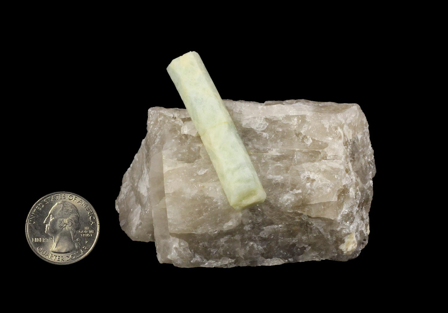 A sharp, translucent, terminated, yellow-green Beryl crystal (Heliodor) positioned perfectly on contrasting Quartz. Nice, lustrous specimen in excellent condition.