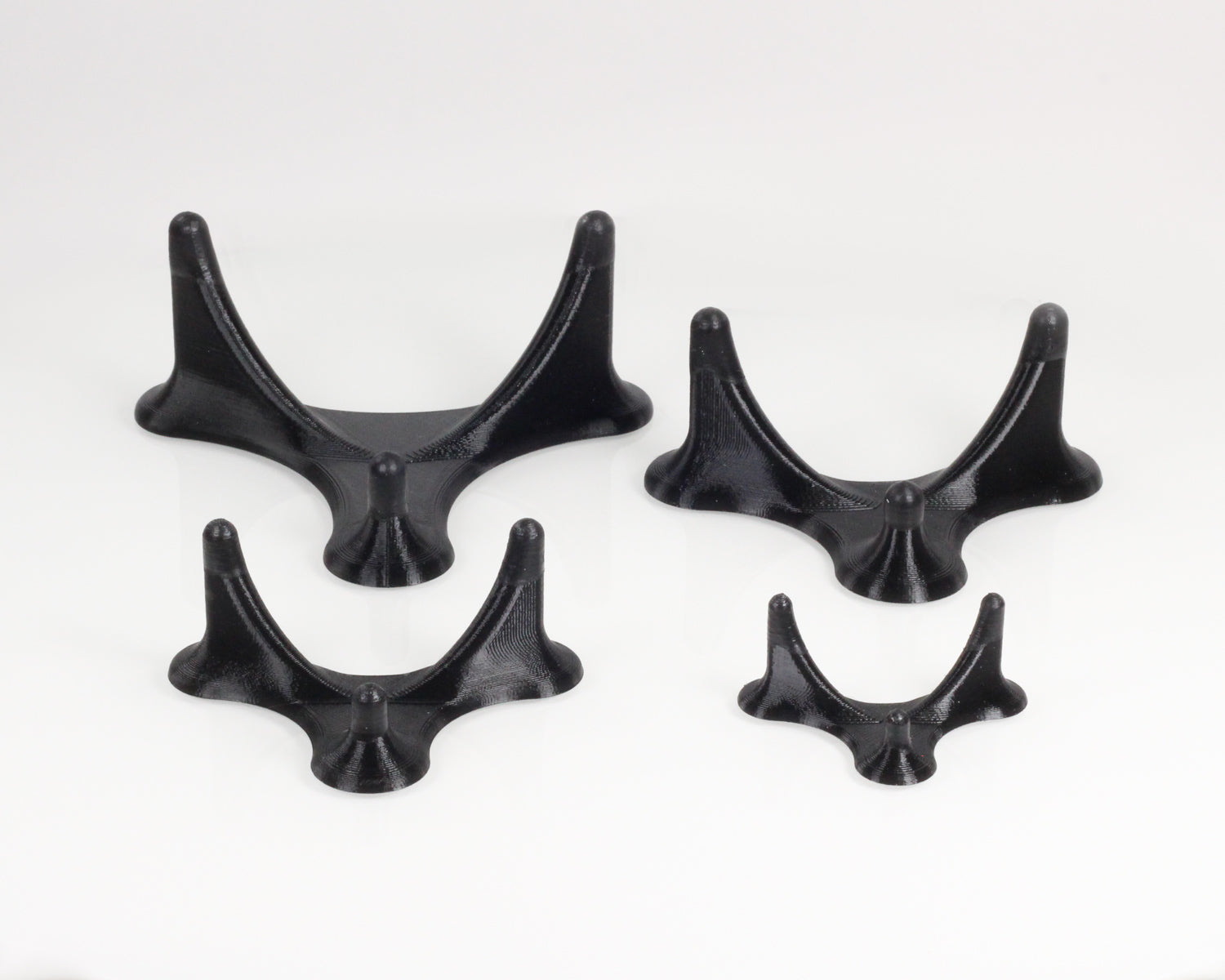 These custom stands are designed to provide enhanced grip and stability for specimens while significantly reducing the risk of damage. Most specimen stands currently on the market are made from rigid plastic and feature straight, round columns with sharp, flat, and hard edges. This rigid design allows specimens to slide off easily, often leading to scratches and other damage. In contrast, these unique custom stands feature curved posts that allow specimens to safely “nest” within them. When displaying a piece at an angle atop all three posts, you'll notice that the posts are rounded and coated with a soft, pliable rubber that securely grips the specimen.