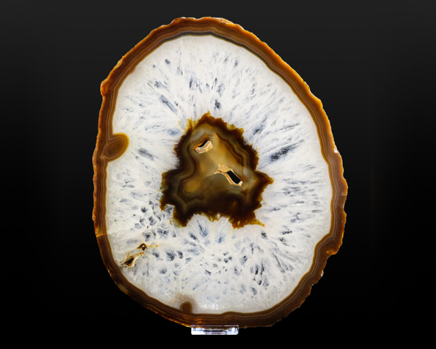 A striking Brazilian Agate slice polished to a mirror finish highlighting the superb natural coloring and banding. This piece display beautifully, especially in front of a light source. A beautiful piece with no damage. All natural, no artificial coloring. (Agates are semi-precious gemstones that are a variegated form of Chalcedony, which is silicon dioxide in the form of microscopic fibrous Quartz crystals. Agates naturally develop when an empty pocket inside a host rock fills in molecule-by-molecule, layer-by-layer as these microcrystals self-organize to form concentric bands or other patterns. The colors and arrangement of the microcrystals are influenced by changes in pressure, temperature, and mineral content that occur during the formations process, thus giving Agates an endless variety of colors, banding patterns and design. Unlike other gemstones, each agate is unique. Even slabs and slices cut from the same specimen will vary in color, banding and design.)
