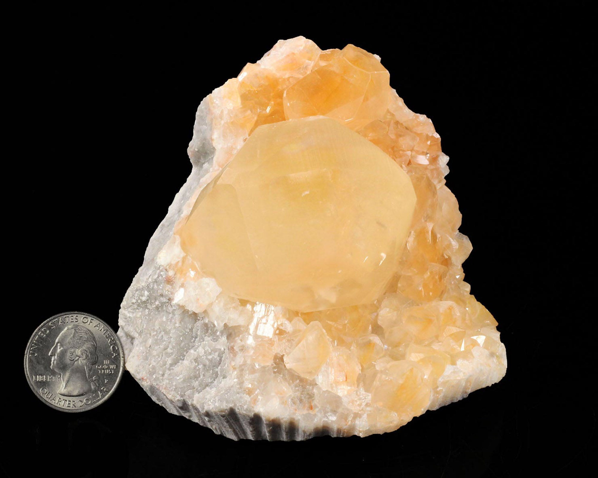 This piece has one large, amber colored, translucent, complex Calcite crystal with a soft, waxy luster (due to the striations noticeable on the closeup pic) situated on a bed of smaller like-colored Calcite crystals. I have rarely seen a Calcite crystal this flawless and large - it is a beautiful, aesthetic and balanced piece in excellent condition.
