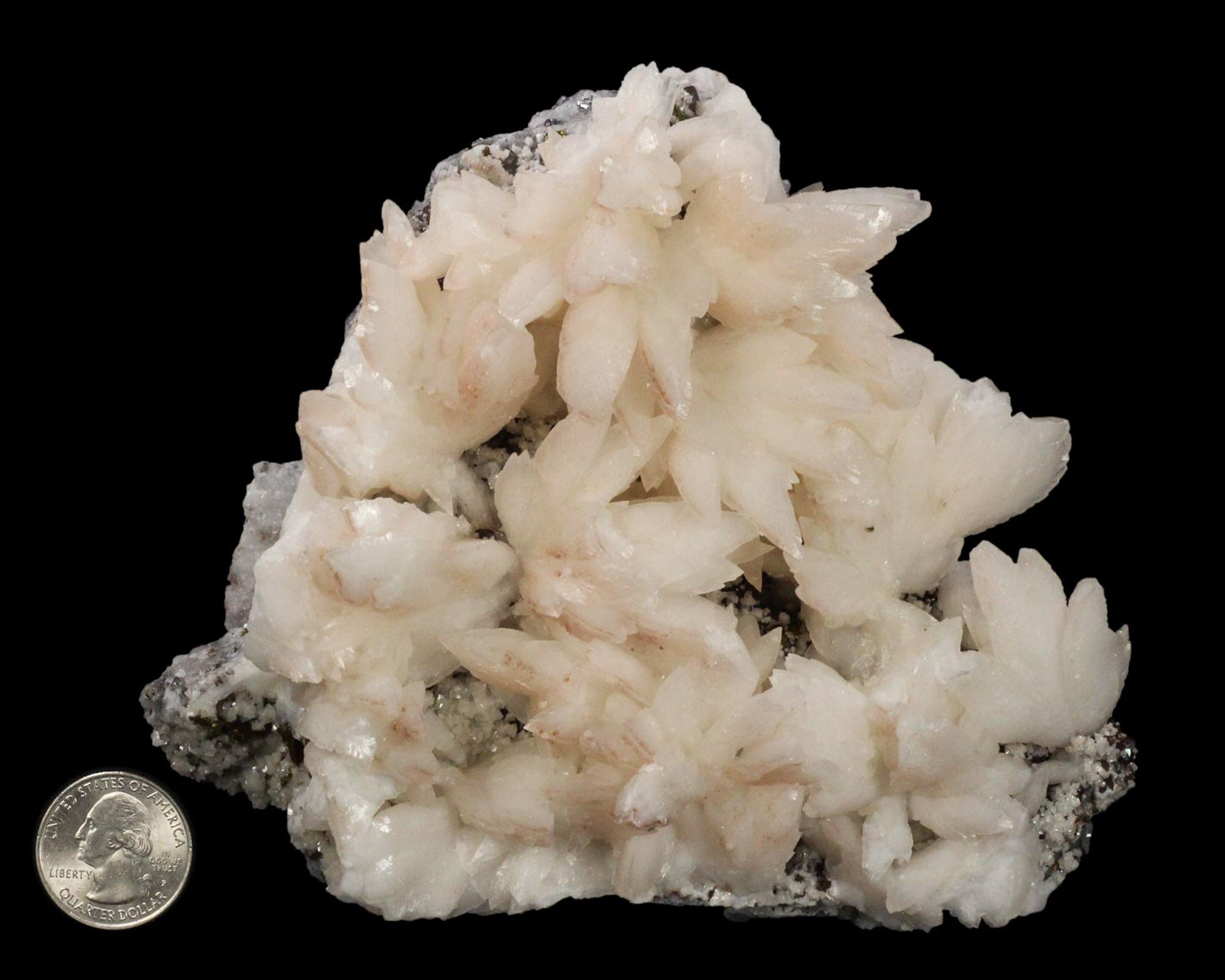 A very large aesthetic specimen hosting numerous radiating flower-like clusters of Calcite scalenohedra. The Calcite crystals are soft-white with minor reddish Hematite inclusions and have a pearly luster. Even the matrix, with colorless Quartz, lustrous Galena and Chalcopyrite, adds to the overall aesthetics of the piece. A couple of the Calcite crystals are incomplete, but that’s to be expected, especially with a piece this large, and is not a detraction in the least. Overall, an outstanding and beautiful specimen.
