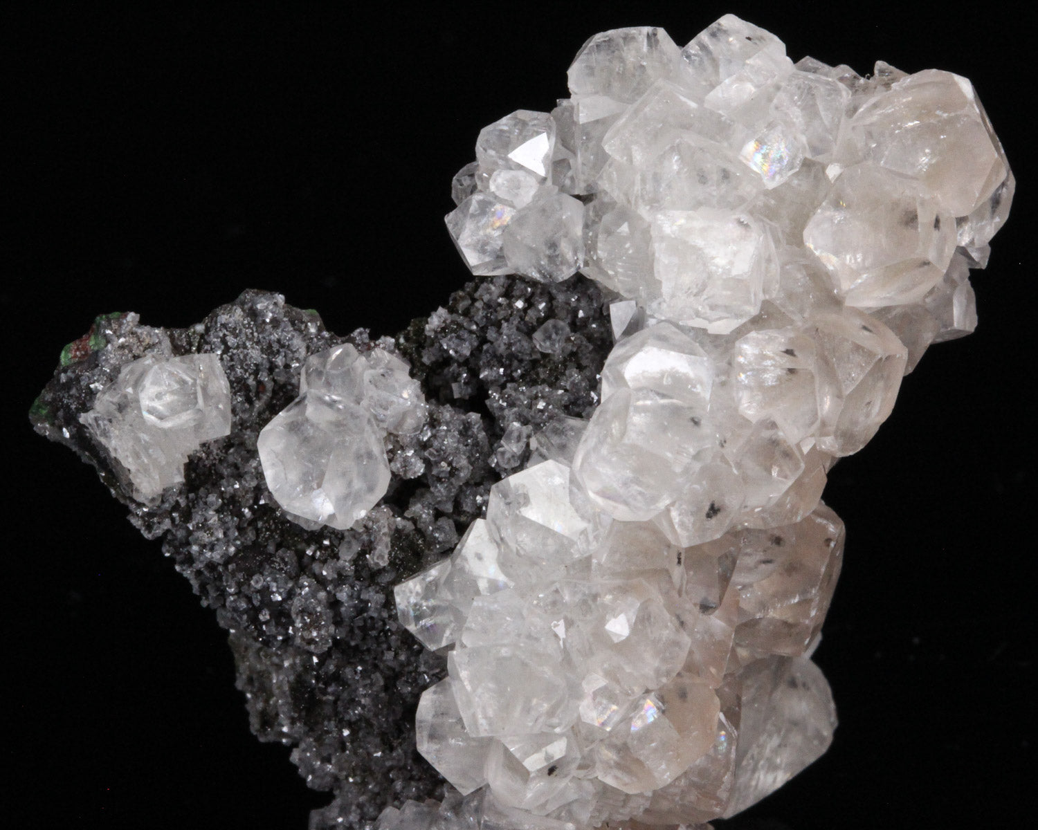 This piece features clusters of prismatic hexagonal Calcite crystals on matrix. The crystals are colorless, transparent to translucent, and vary in size throughout the piece. Good luster - even the matrix has a sparkling druzy luster. In excellent condition.