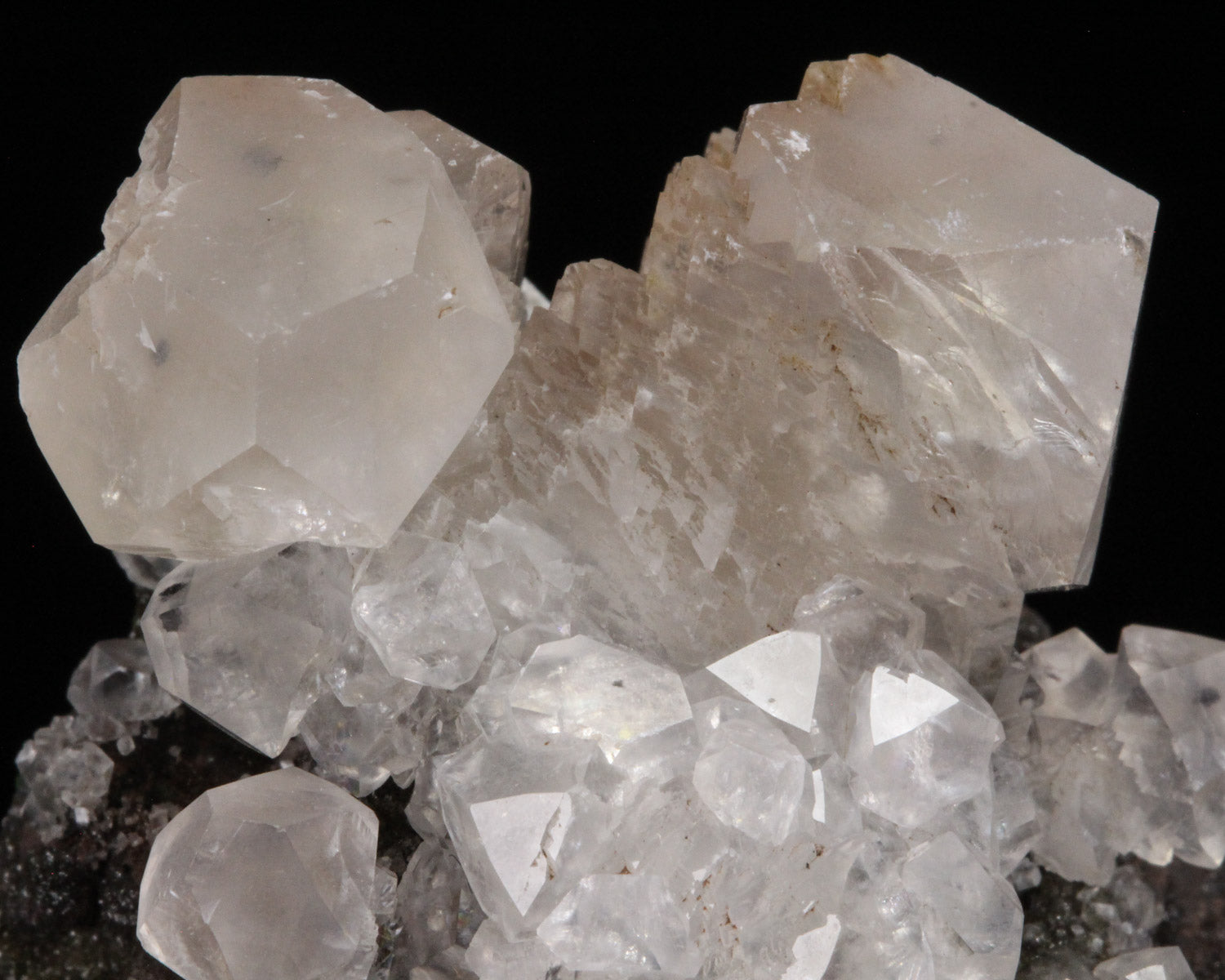 This piece features clusters of prismatic hexagonal Calcite crystals on matrix. The crystals are colorless, transparent to translucent, and vary in size throughout the piece. Good luster - even the matrix has a sparkling druzy luster. In excellent condition.