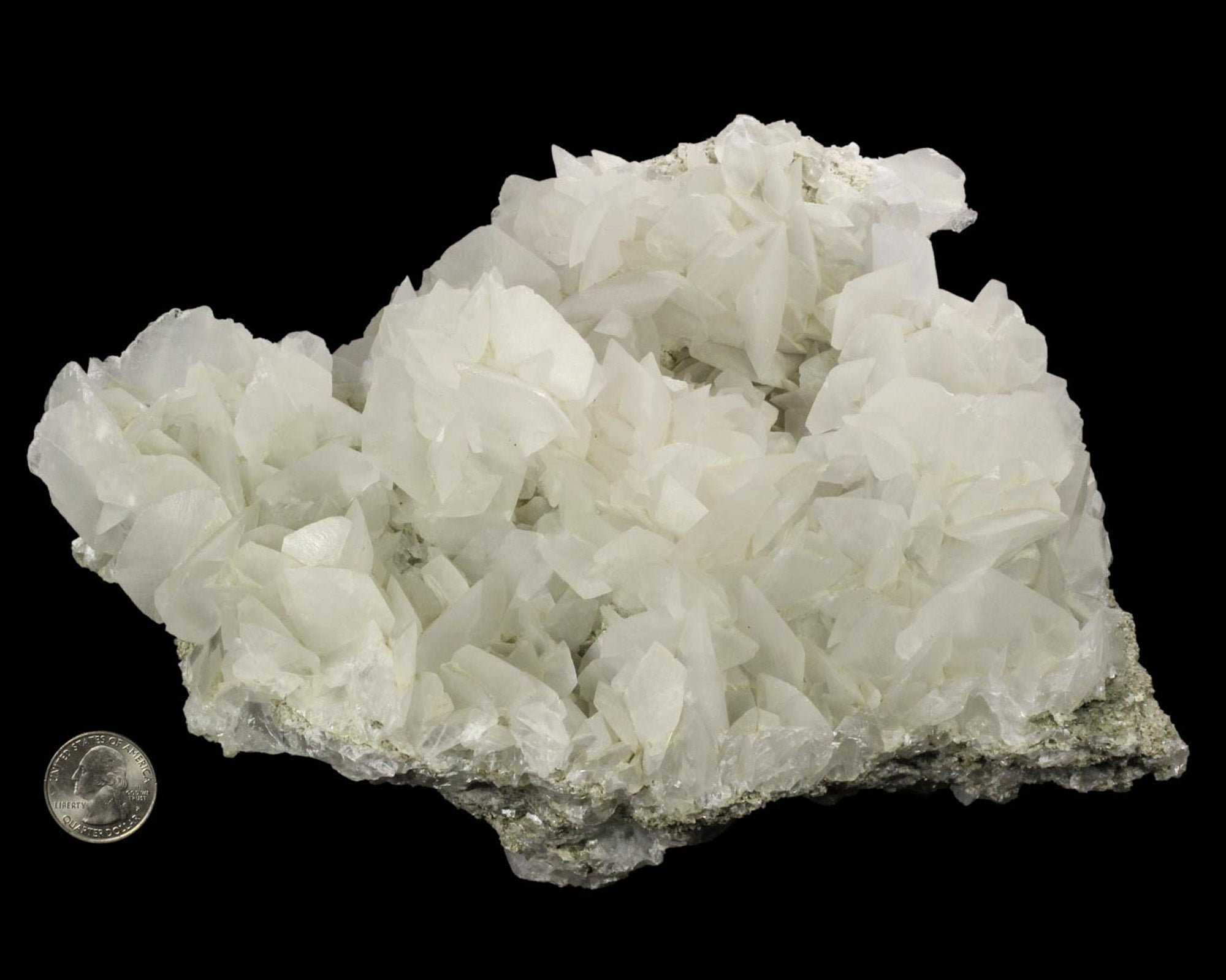 An exceptionally large specimen hosting numerous translucent, white flattened rhombohedral Calcite crystals on matrix. The Calcite crystals have a soft, waxy luster, are striated, and are quite large. There is crystal growth in the voids, particularly evident on the bottom of the piece (though it’s not the easiest piece to view the bottom - it’s just really big and heavy). It is a superb, aesthetic piece in excellent condition; a beautiful showpiece for any collection.