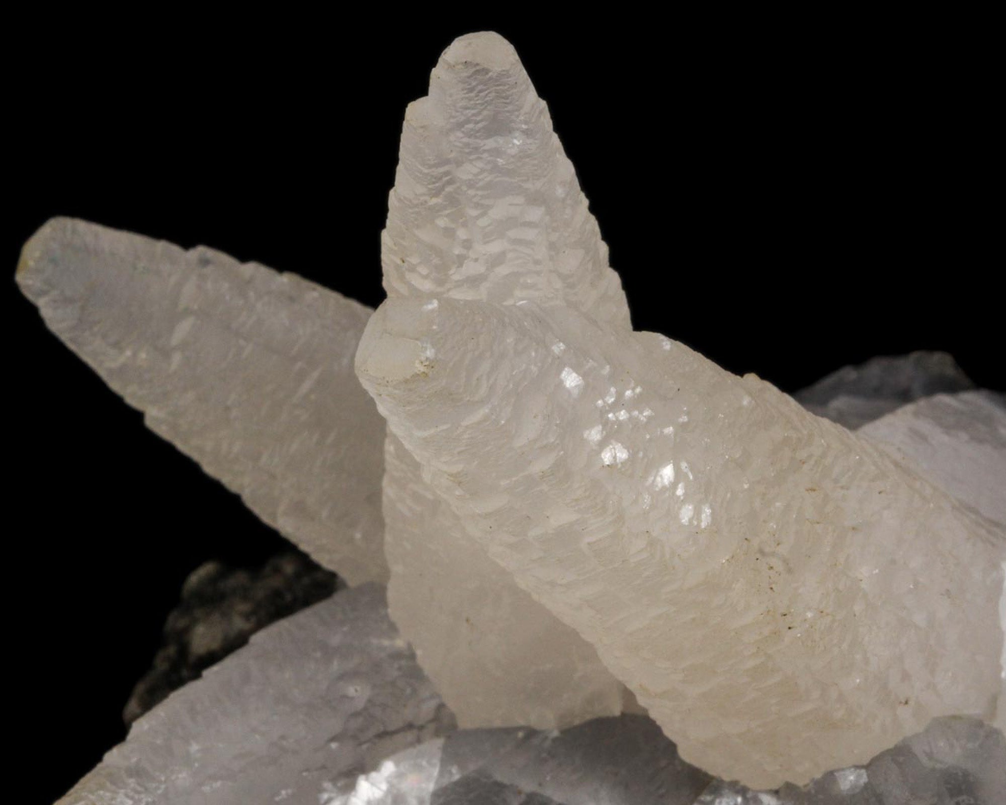 This very aesthetic piece features a dark matrix hosting four elongated, highly translucent, pristine stepped Calcite crystals all with “nail-head” terminations. This is a unique piece with great contrast and symmetry. In excellent condition.