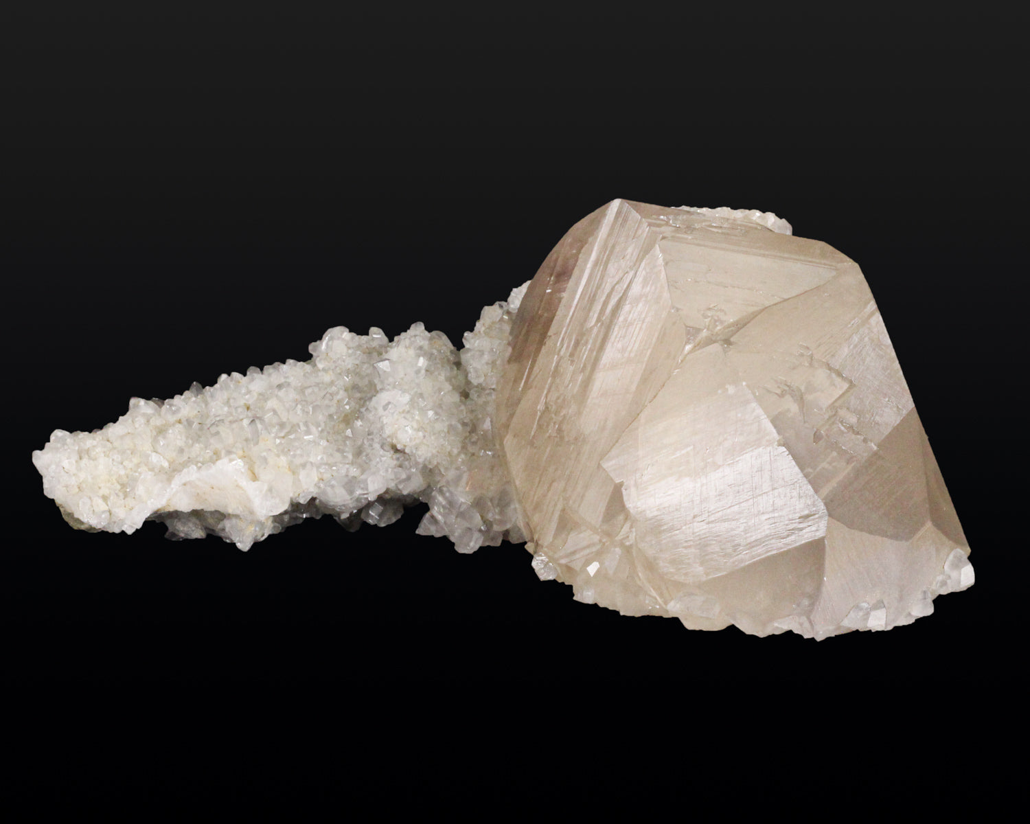 An exceptionally large and striking piece featuring a huge lustrous, cognac-colored Calcite twin on a large “tail” of colorless to white druzy Quartz. The crystal faces are pristine, with visible striations and sharp edges. The luster appears “wet”. The contrast between the Calcite and Quartz is striking. All in all, it’s an amazing piece, and a great addition to any collection. No damage.