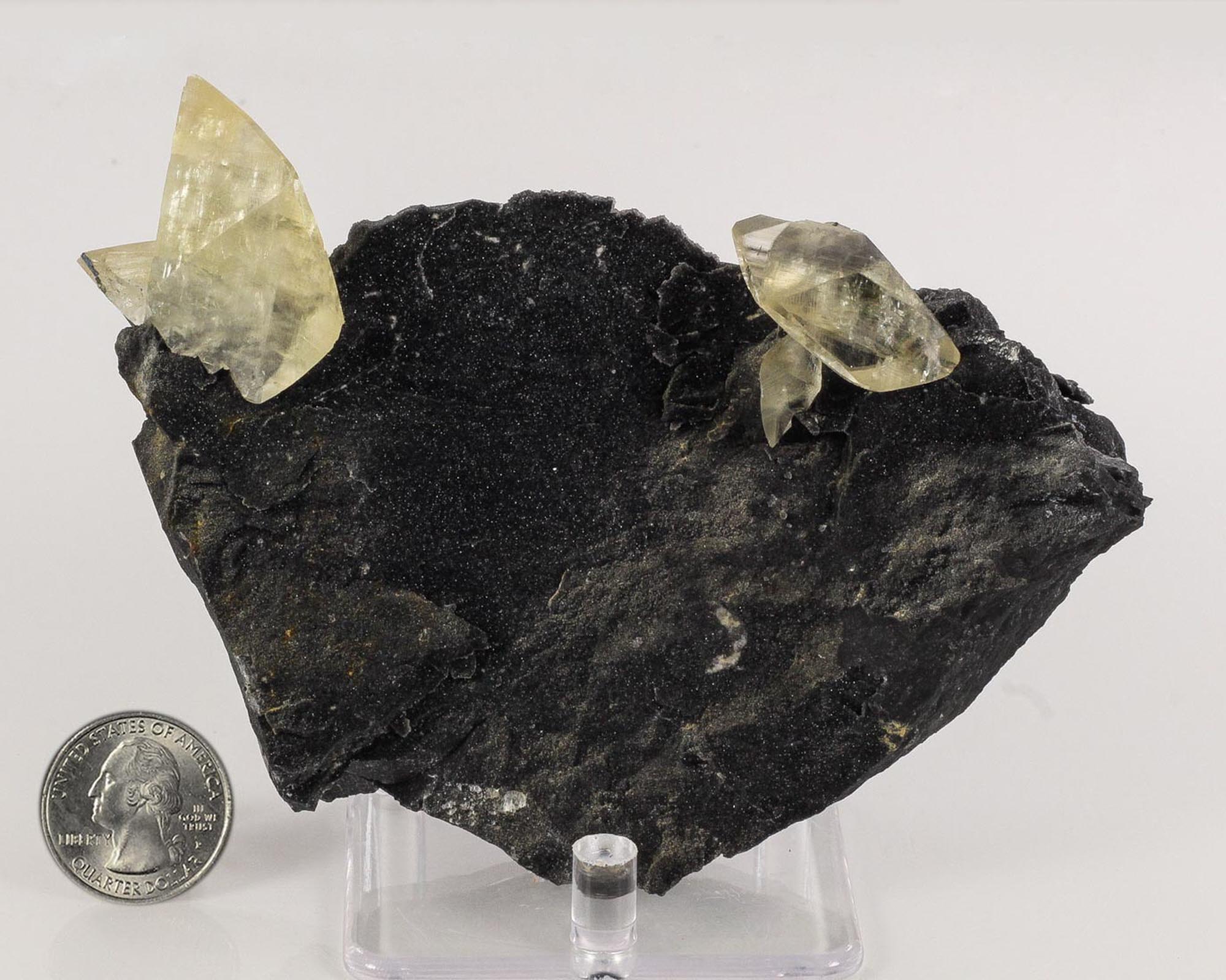 This piece has great contrast with translucent to transparent lenticular Calcite crystals on a dark matrix. The Calcite crystals, especially the ones in front, are pristine and gemmy, while the one in back has several Stibnite inclusions (see pics). This is an attractive and showy piece in great condition!