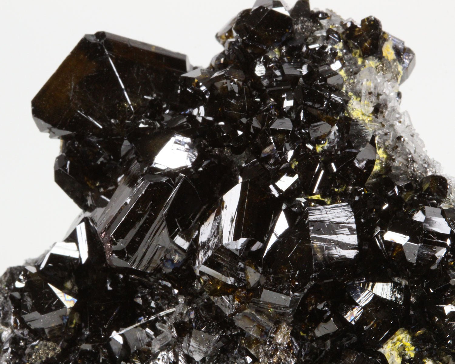 This cabinet-sized piece features a dense coating of black, lustrous, sharp Cassiterite crystals with minor clear Quartz on matrix from the famous Viloco Mine in Bolivia. The Cassiterite crystals are exceptionally large, very sharp and mirror-like and contrast nicely with the Quartz crystals. The crystal edges reveal an unexpected golden-brown translucency. A very aesthetic piece with great color, luster and crystal formation. In excellent condition.