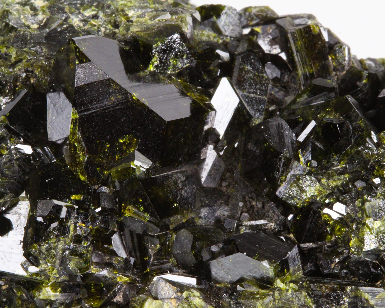 A lustrous dark-green cluster of Epidote crystals with striations and wedge-shaped terminations on a matrix of crystallized massive Epidote. Under lighting, the classic pistachio-green can be clearly seen. A very aesthetic specimen of Epidote in excellent condition.