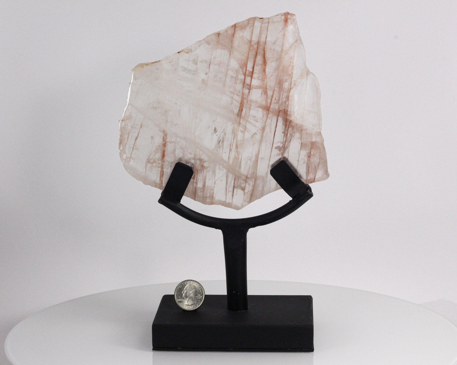 A large, beautiful transparent polished Fire Quartz slice from Madagascar. Also referred to Hematoid Quartz, this is a slice of colorless Quartz that has been included with streaks of the mineral Hematite which creates the striking reddish streaks and marbling throughout the Quartz. A very aesthetic and natural piece with no artificial colors or dyes. Includes pictured stand.