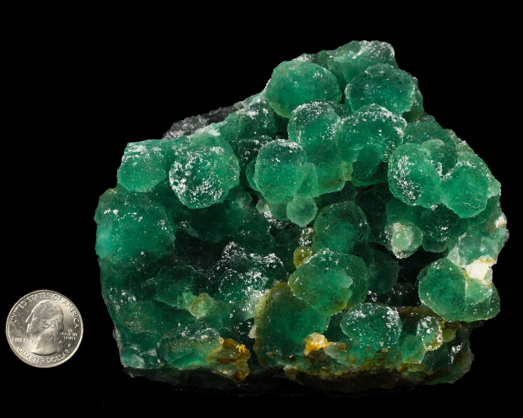 Numerous, lustrous, highly translucent green modified cubo-octahedral Fluorite crystals on massive Fluorite. First, the color is striking - not your typical green Fluorite, but more of a deep emerald green. Second, the crystals at first glance appear to be botryoidal in formation, but at a closer look, especially under a magnifying glass, they are cubo-octahedral in form that have been completely micro-stepped. Because of all of the parallel faces, the luster is a cross between sparkly and satin. A beautiful aesthetic piece in excellent condition.
