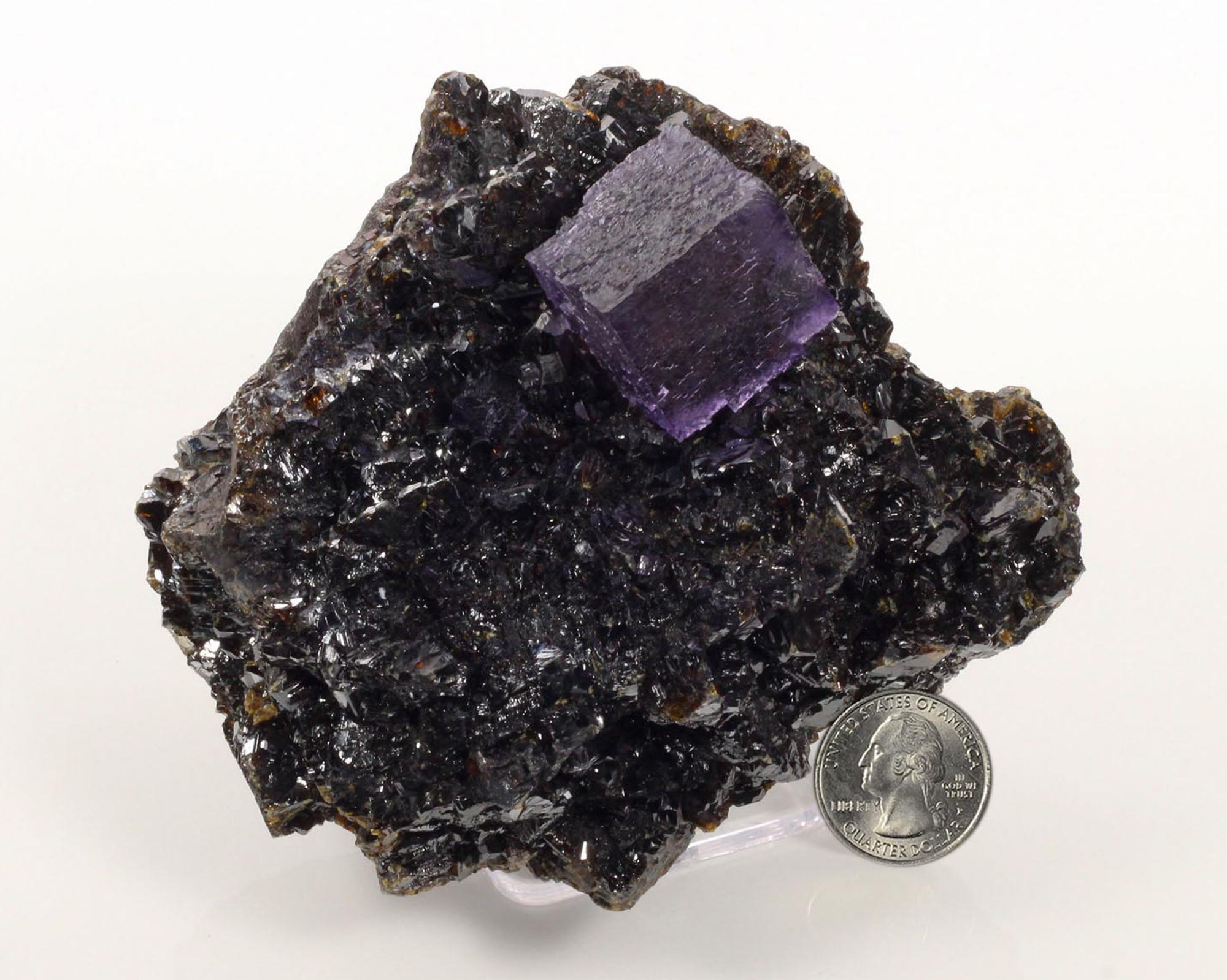 Incredibly aesthetic specimen from the famed Elmwood Mine in Tennessee. It boasts a beautiful well formed Fluorite crystal on lustrous Sphalerite. Even the Sphalerite is translucent, showing a deep amber color under lighting. The Fluorite crystal is complete, deep purple, exhibits some stepped growth, translucent with great luster and in excellent condition - an awesome piece!