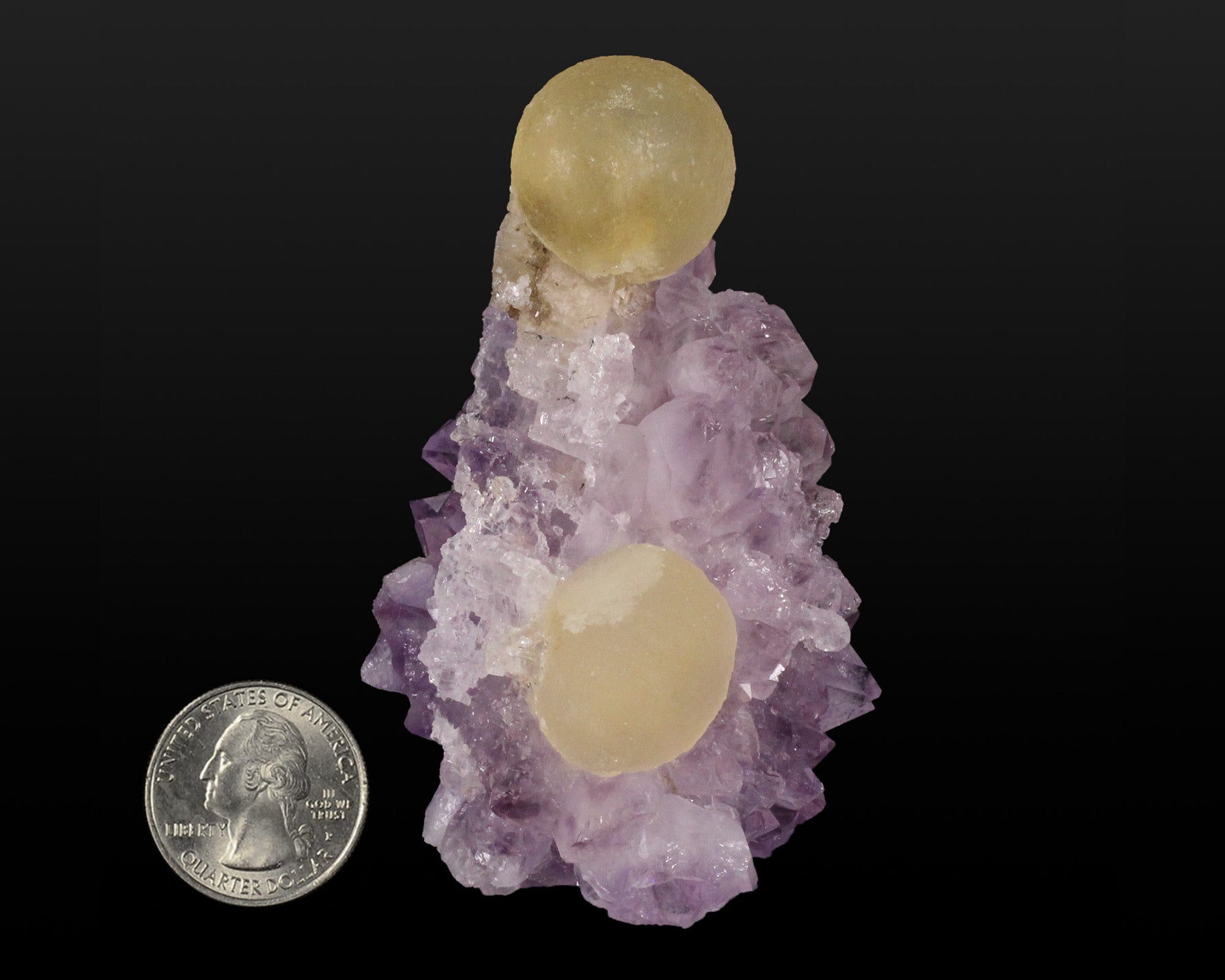 This is a superb and unique piece featuring two complete and perfect spherical formations of highly translucent yellow Fluorite on a vertical plate of lustrous Amethyst Quartz crystals. Yellow Fluorite spheres of this quality and size are very hard to find, let alone sitting on a bed of Amethyst Quartz crystals is even harder. An awesome and aesthetic piece with excellent contrast, symmetry, crystal formation and luster. No damage.