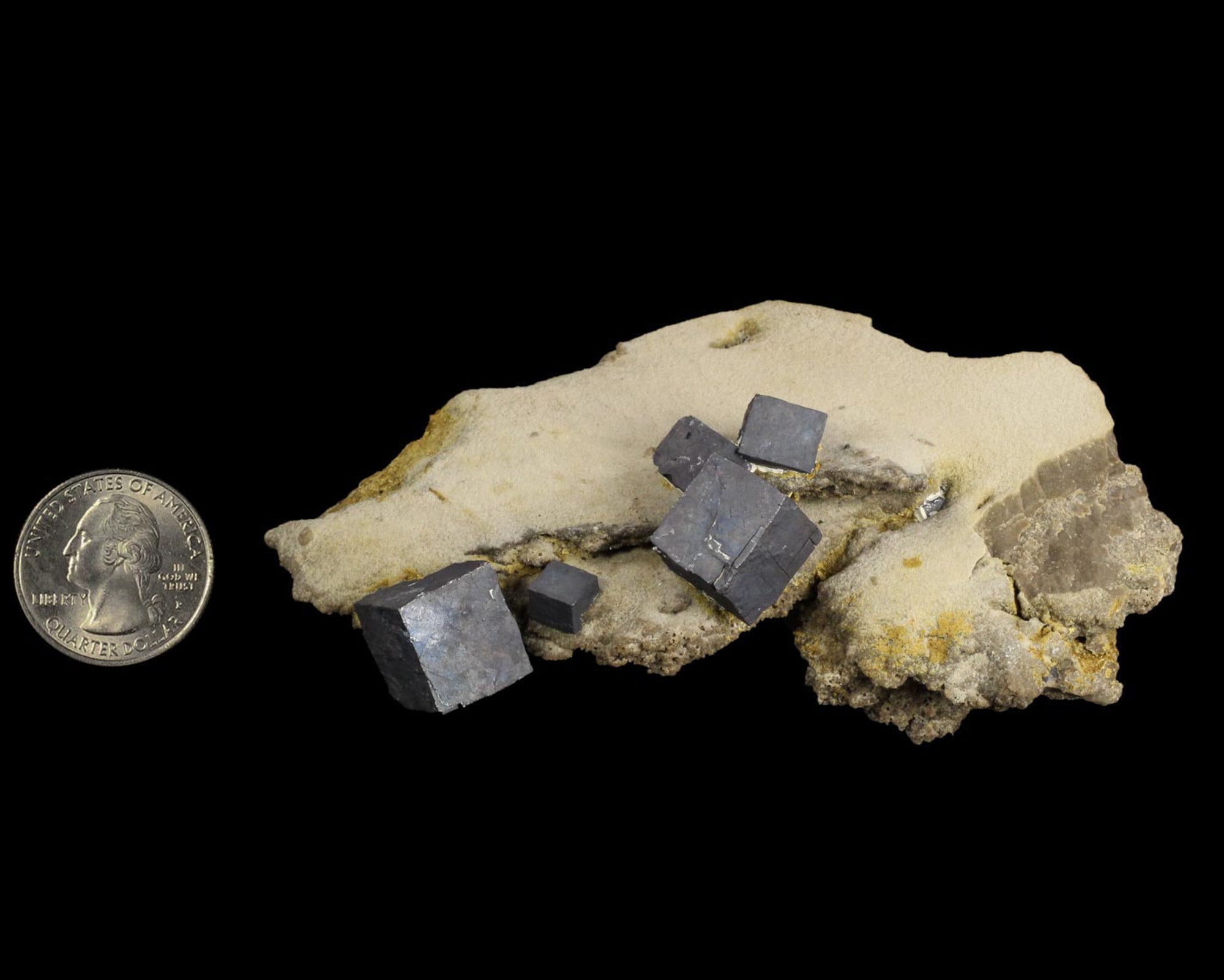 A plate of light-brown Chert hosting several sharp cubic Galena crystals, including a few miniature Galena crystals on the bottom of the matrix. An excellent specimen from the now-closed mines of Picher, Oklahoma.