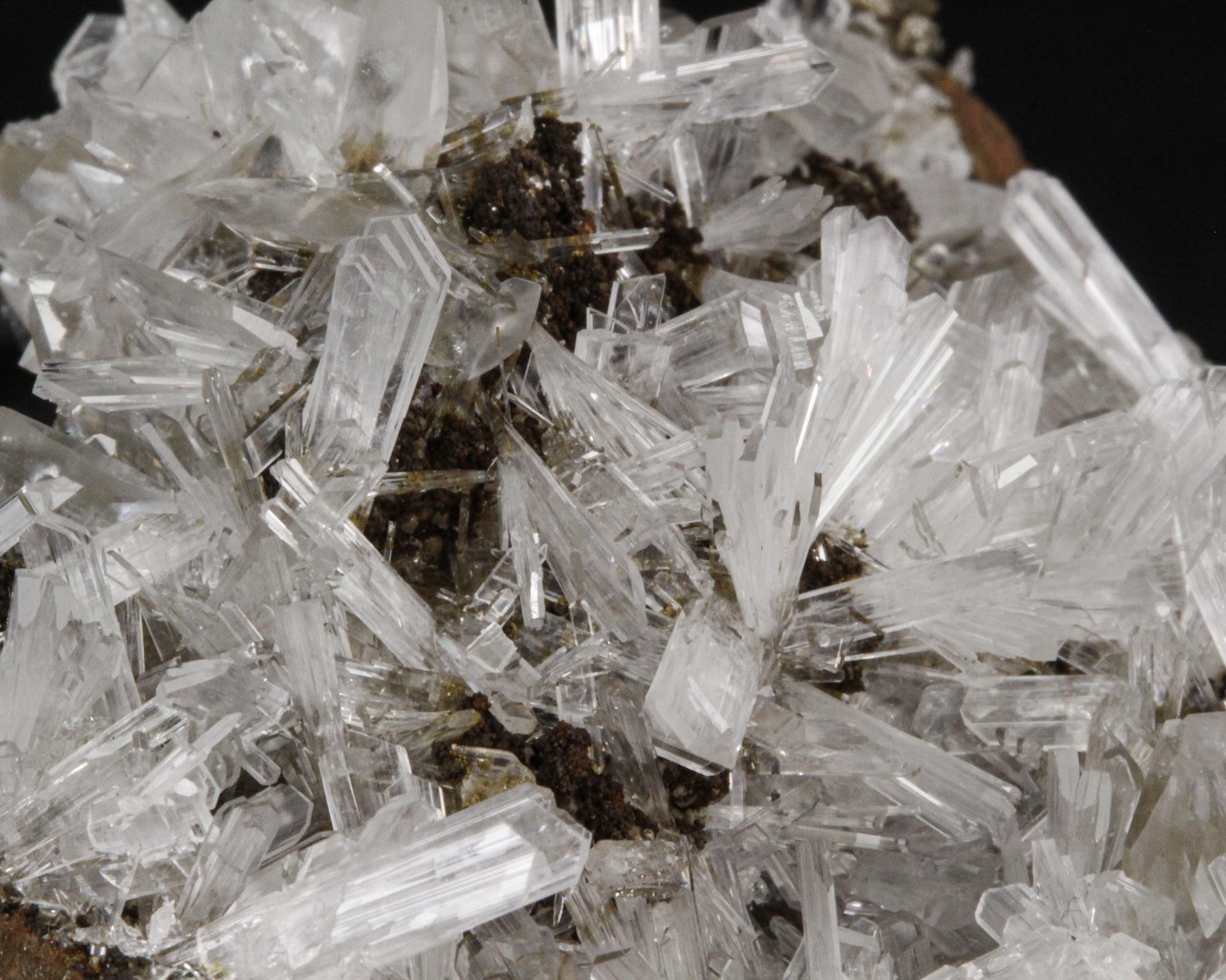 A cluster of numerous lustrous, transparent colorless bladed Hemimorphite crystals with translucent to transparent, well formed platy/lenticular Calcite crystals on a dark brown Limonite matrix. Great contrast, crystal formation and symmetry. In excellent condition.