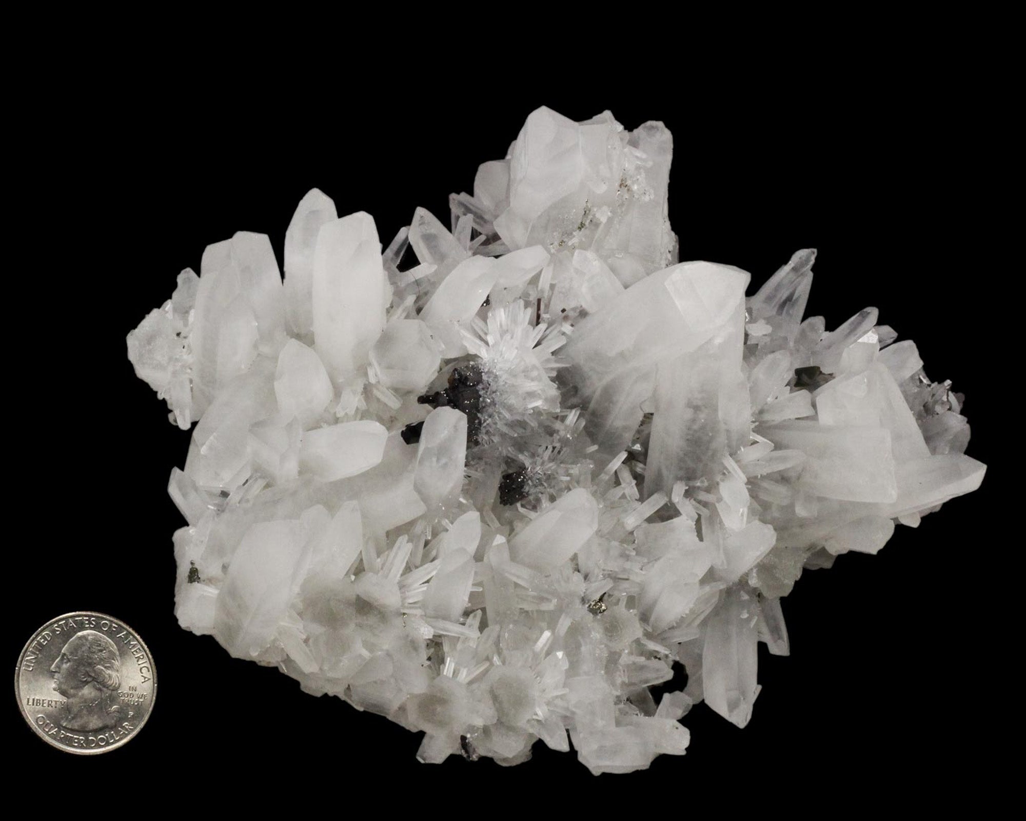 This specimen features both a larger and smaller cluster of jet-black, lustrous Hubnerite crystals, both centered on a plate of highly translucent to transparent Quartz crystals. At the base of both clusters are radiating clusters of miniature Quartz crystals. There’s also a well formed crystal of Chalcopyrite on the plate. The Hubnerite, Quartz and Chalcopyrite crystals are all in excellent condition and perfectly terminated. I would expect to see on a plate hosting this many Quartz crystals an occasional issue with the terminations, but after thoroughly checking the piece, there are none. A beautiful piece with amazing contrast and balance and in excellent condition.