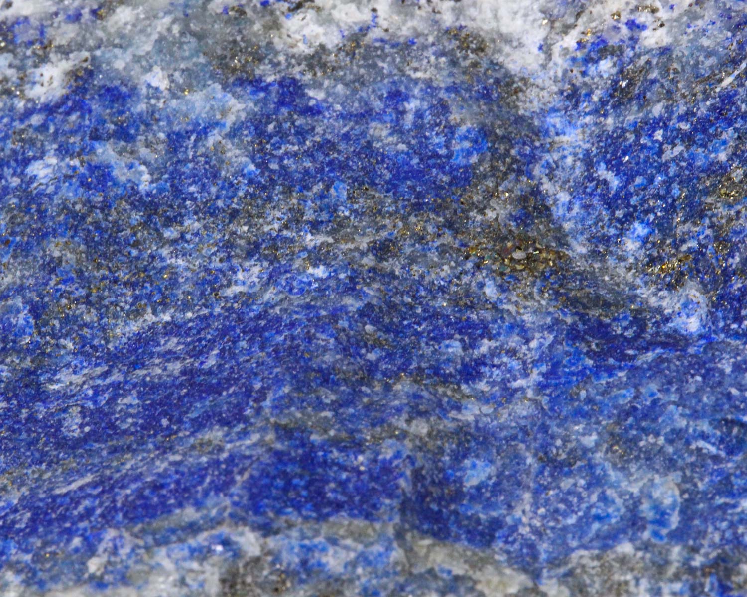Lapis Lazuli is a beautiful semi-precious gemstone that features indigo-blue Lazurite, golden Pyrite and Calcite. The deep-blue coloring is from Lazurite, the metallic gold sparkles are from Pyrite, and the white veining is from Calcite. Lapis Lazuli (or Lapis for short) is formed from Metamorphic processes, and has been prized for its intense deep-blue color and use as a semi-precious stone since antiquity. I have numerous pieces of polished Lapis, but this large piece caught me eye in being able to see Lapis in its raw, unpolished and natural layered formation. To me it’s just as striking as the polished version!