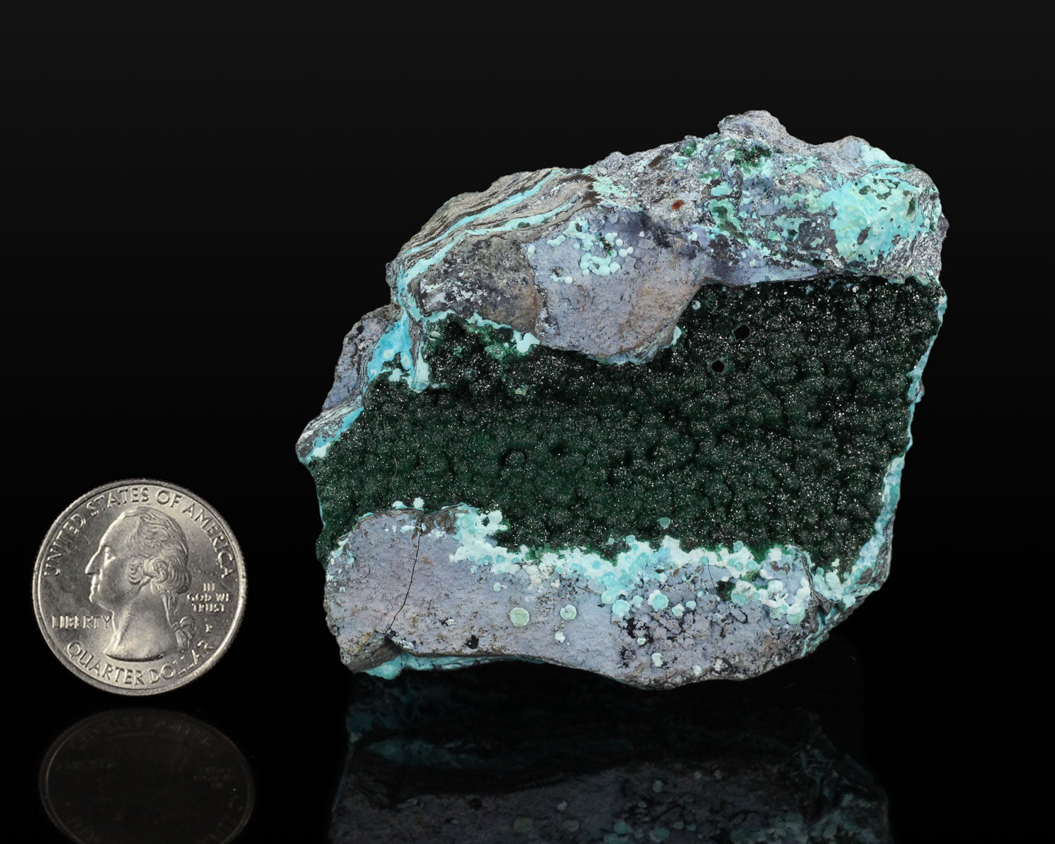 A nice combination piece featuring a shallow vug lined with deep-green crystalline Malachite with accents of sky-blue Chrysocolla throughout the piece, especially on the back. Great color and contrast. In excellent condition.