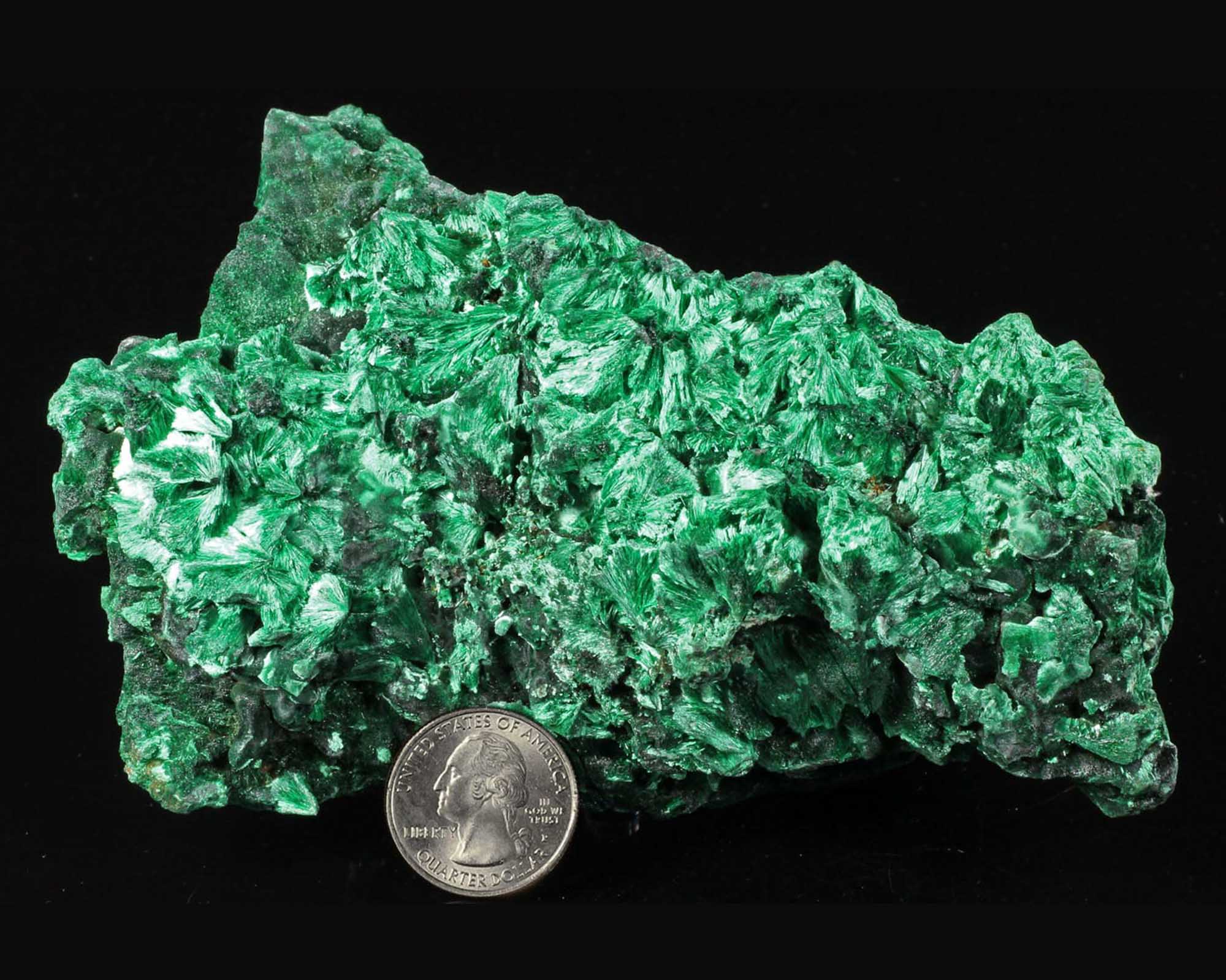 A large specimen of fibrous Malachite. The rare “leafy”-like crystals, formed from dense intergrowths of tiny, “fibrous” needles, create a stunning visual with a silky luster and dominate the piece both front and back. In excellent condition.