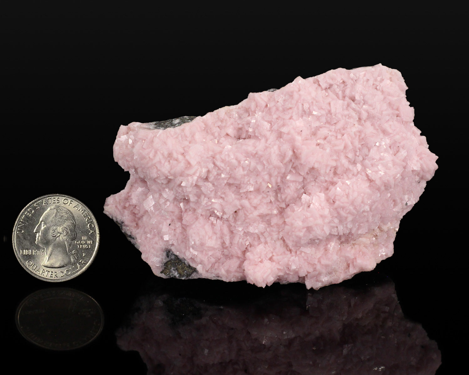 A large plate featuring a layer of lustrous, pink, intergrown Mangano Calcite rhombohedrons on a dark matrix from Tsumeb. Fantastic color, and great contrast with the matrix. In excellent condition.