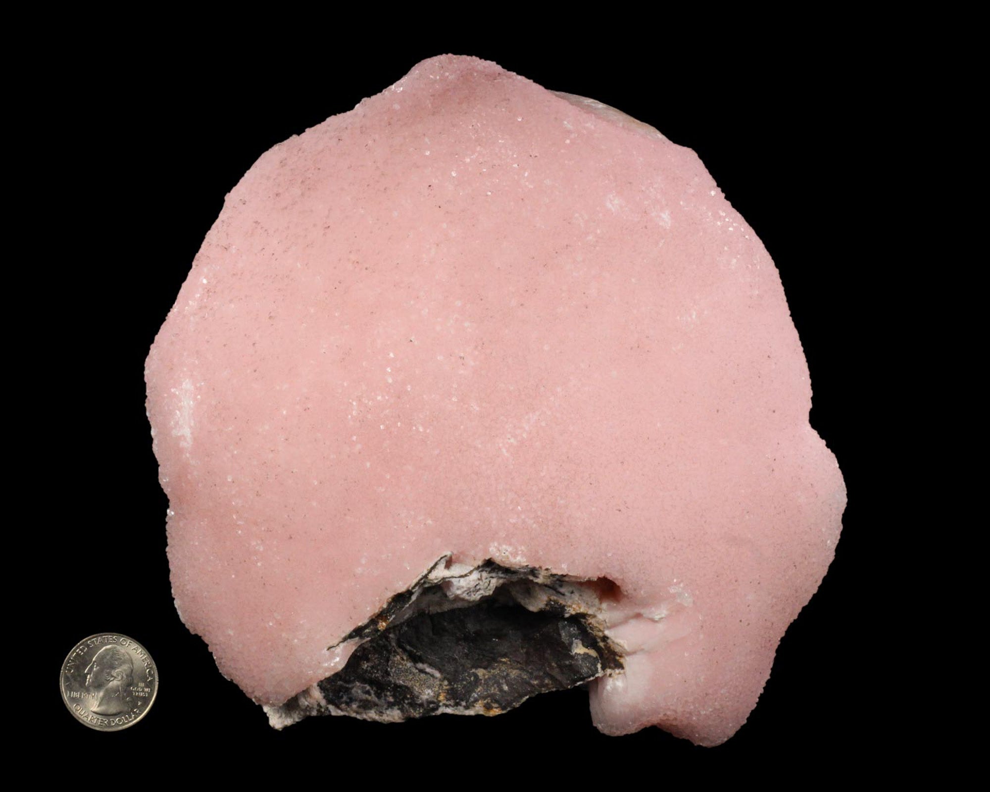 An exceptionally large, hemispherical specimen of rich-pink Manganoan Calcite, exhibiting an inter-grown, fan-shaped, radiating crystal habit on a massive scale, and I mean massive. I haven’t seen a piece this large or well formed before. There are miniature crystals covering the entire front surface of the hemisphere creating a beautiful, sparkly luster. On the back of the piece where it was removed from the pocket wall you can see the radial growth/fan-shaped habit and crystal termination in the cross-section. Even more amazing is the addition of a matrix perfectly centered and visible on the bottom. This is truly a stunning piece and a highlight in any collection. In excellent condition.