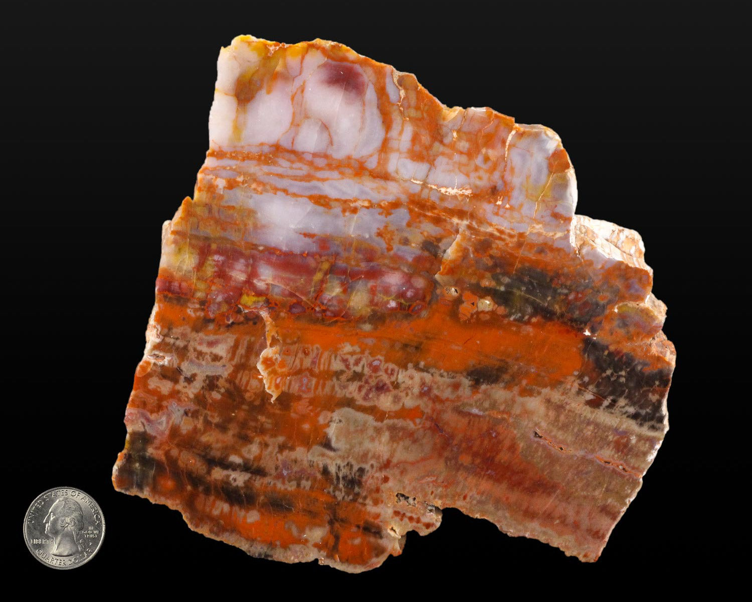 Years ago, large conifer logs were buried quickly and deeply by huge amounts of sediment. Mineral-saturated water flowed through the sediment, depositing numerous forms of Quartz crystals in the plant’s cells, completely replacing all organic material until all that was left was a near perfect crystalized mold of the previously existing tree, preserving the original structure in perfect detail. Each piece is unique, colored by various mineral impurities in the Quartz, including Cobalt, Copper and Chromium (green/blue), Iron Oxides (red, brown, yellow), Manganese (pink/orange), Carbon (black), and Manganese Oxides (black/yellow).