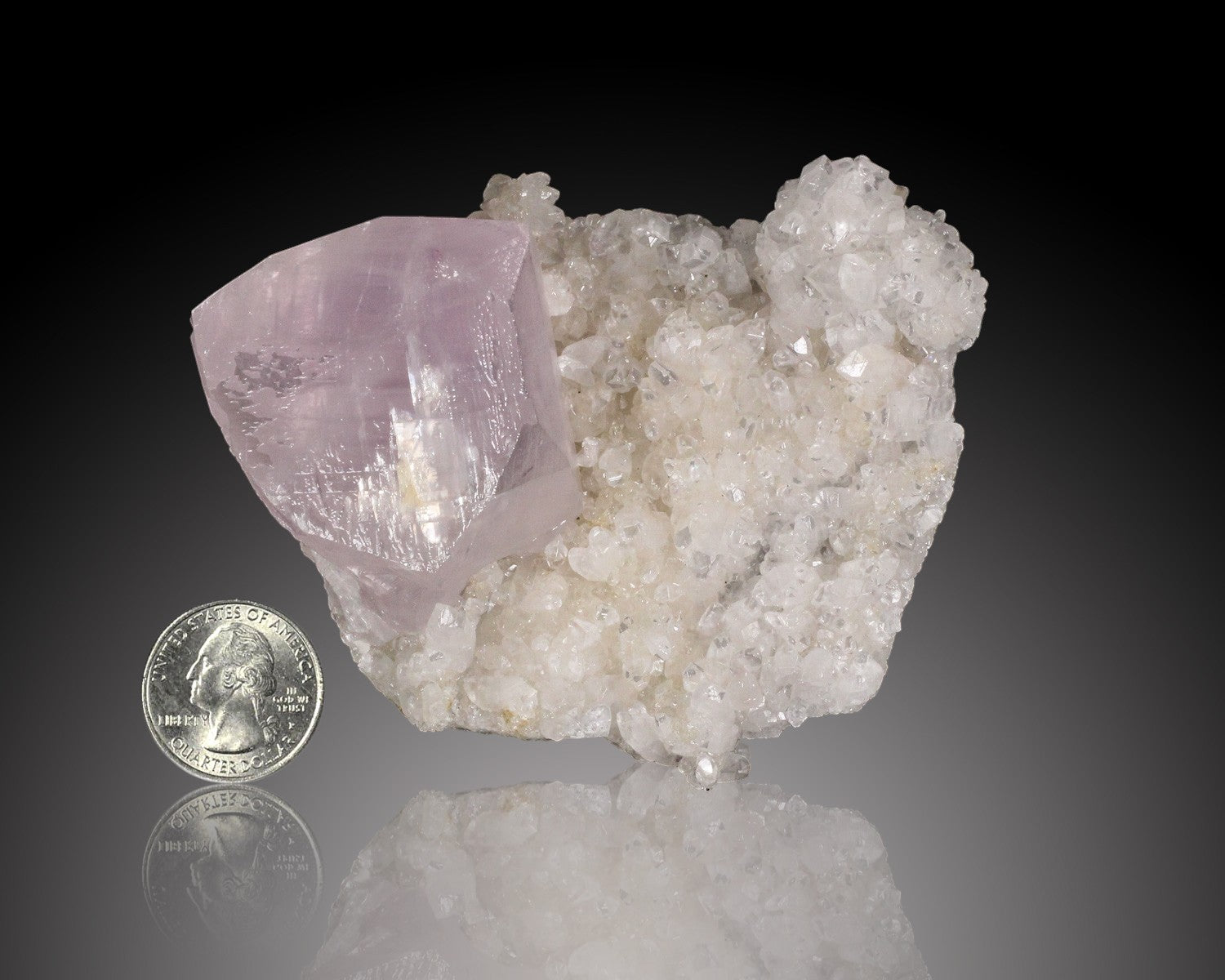 A stunning, large, gemmy pink complex Calcite crystal (complex: a combination of rhombohedral and scalenohedral crystal forms) on a contrasting plate of clear, gemmy Quartz crystals/druzy. Amazing crystal formation, color and contrast! In excellent condition.