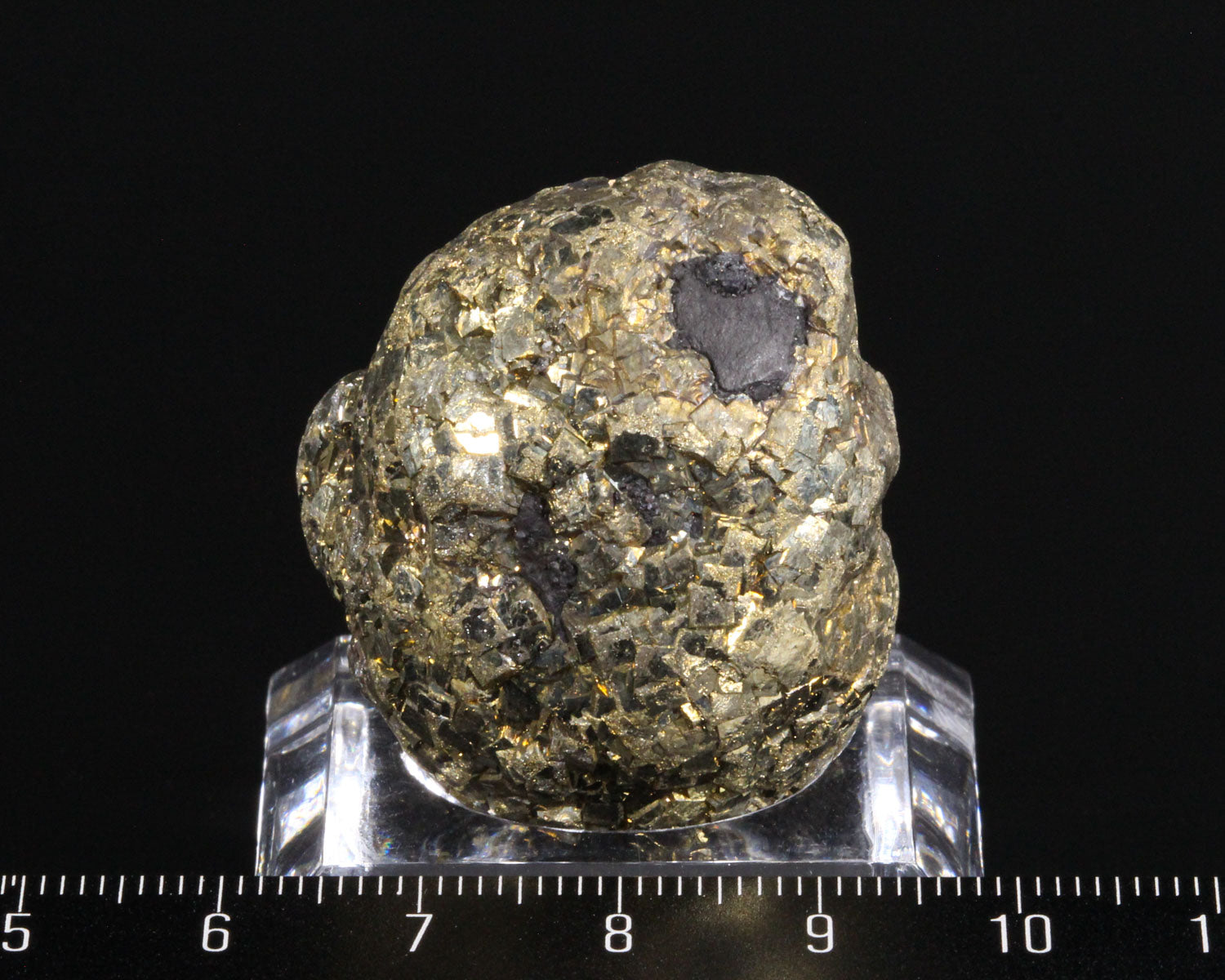 A spherical nodule of golden-metallic Pyrite crystals. The nodule is covered on all sides with Pyrite crystals. Very unique formation and in excellent condition.