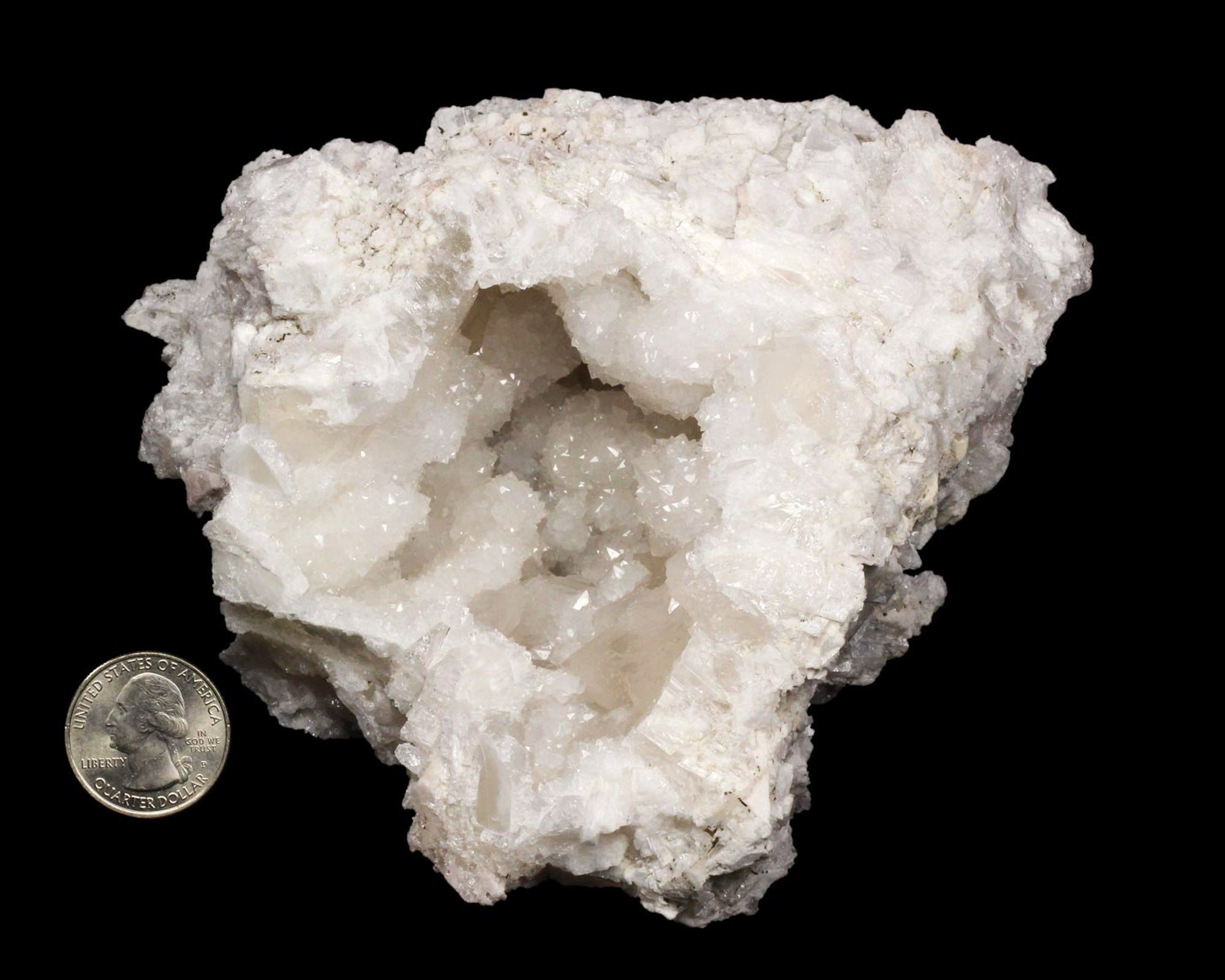 An unusual Geode filled with predominantly Quartz crystals with some Calcite crystals closer to the opening. The Quartz crystals are miniature and transparent, thus a sparkly luster, whereas the Calcite crystals are more off-white in color and lustrous due to the larger crystal faces. The outside of the geode is also quite lustrous due to the reflective crystalline surfaces and white color of the Quartz and Calcite. A showy and beautiful piece in excellent condition.