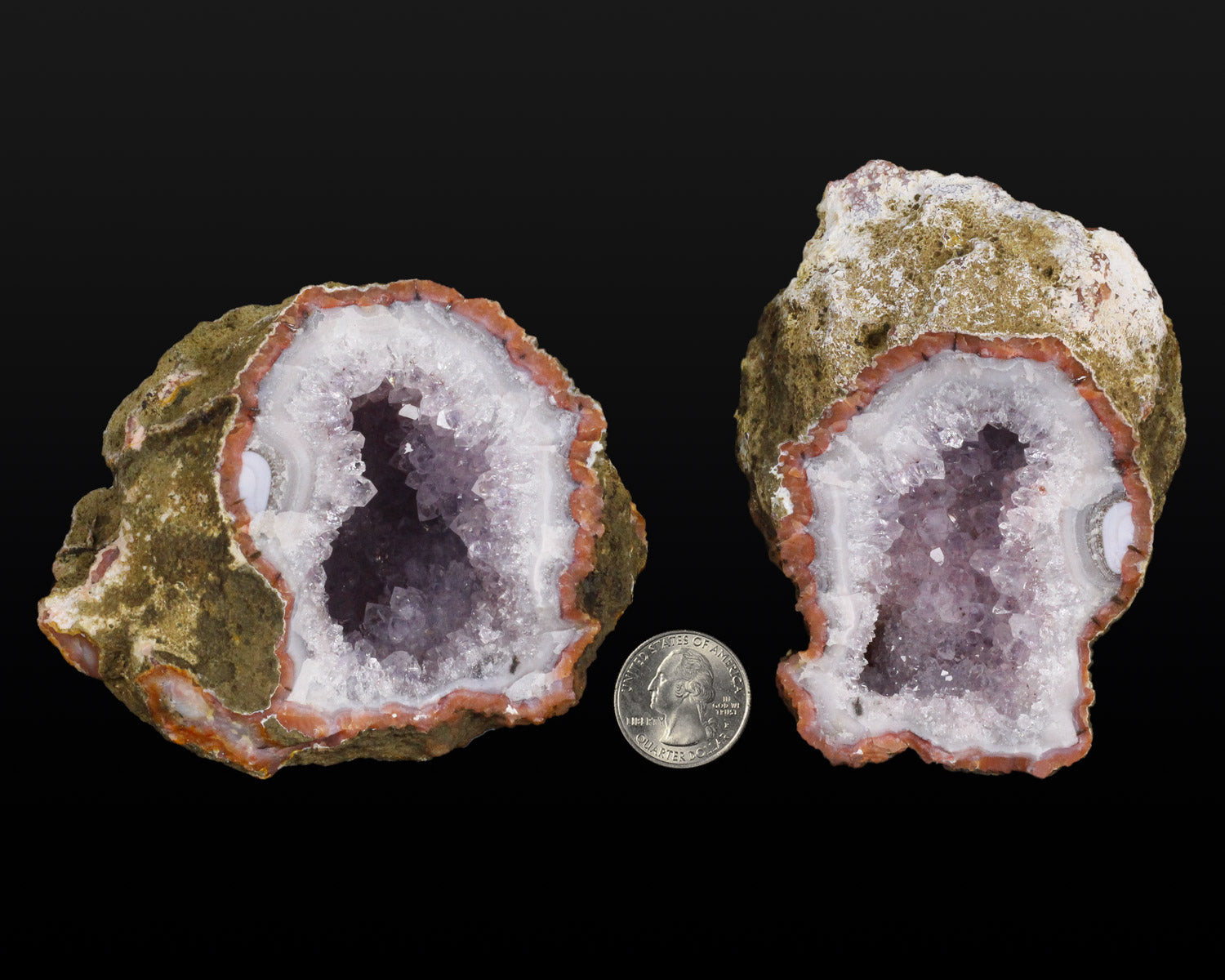 A very aesthetic piece featuring two halves of an Amethyst Geode. The pink-purple Amethyst crystals are on a colorless Quartz which itself is on a layer of translucent, light-gray Chalcedony. The color, luster and contrast is impressive. To see two matched halves displayed is an eye-catcher. When the two halves are put together, it’s hard to imagine there’s any value in the piece - just looks like a dirty, ordinary rock - but once it’s opened it’s a great piece. Both halves are in excellent condition.