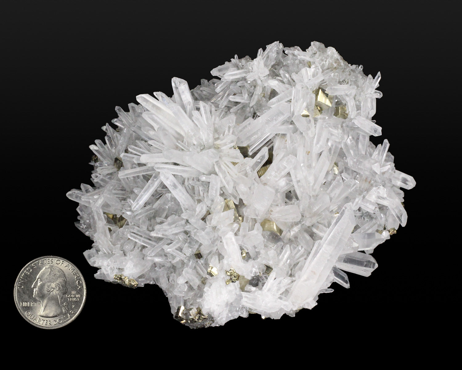 A large plate densely covered with colorless transparent Quartz “needles” with numerous lustrous metallic-gold Pyrite crystals. This combination creates a very lustrous and aesthetic specimen that sparkles due to the myriad of reflective faces. In excellent condition.