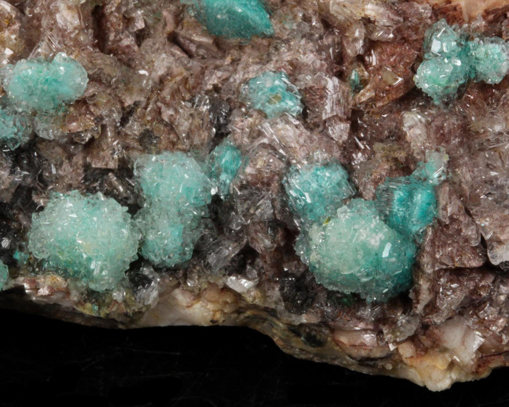 An aesthetic specimen featuring numerous Rosasite spherical crystal aggregates coated by transparent, colorless Selenite crystals on a Dolomite Matrix. The result is a beautiful sparkly luster across the entire piece. A beautiful specimen in excellent condition.