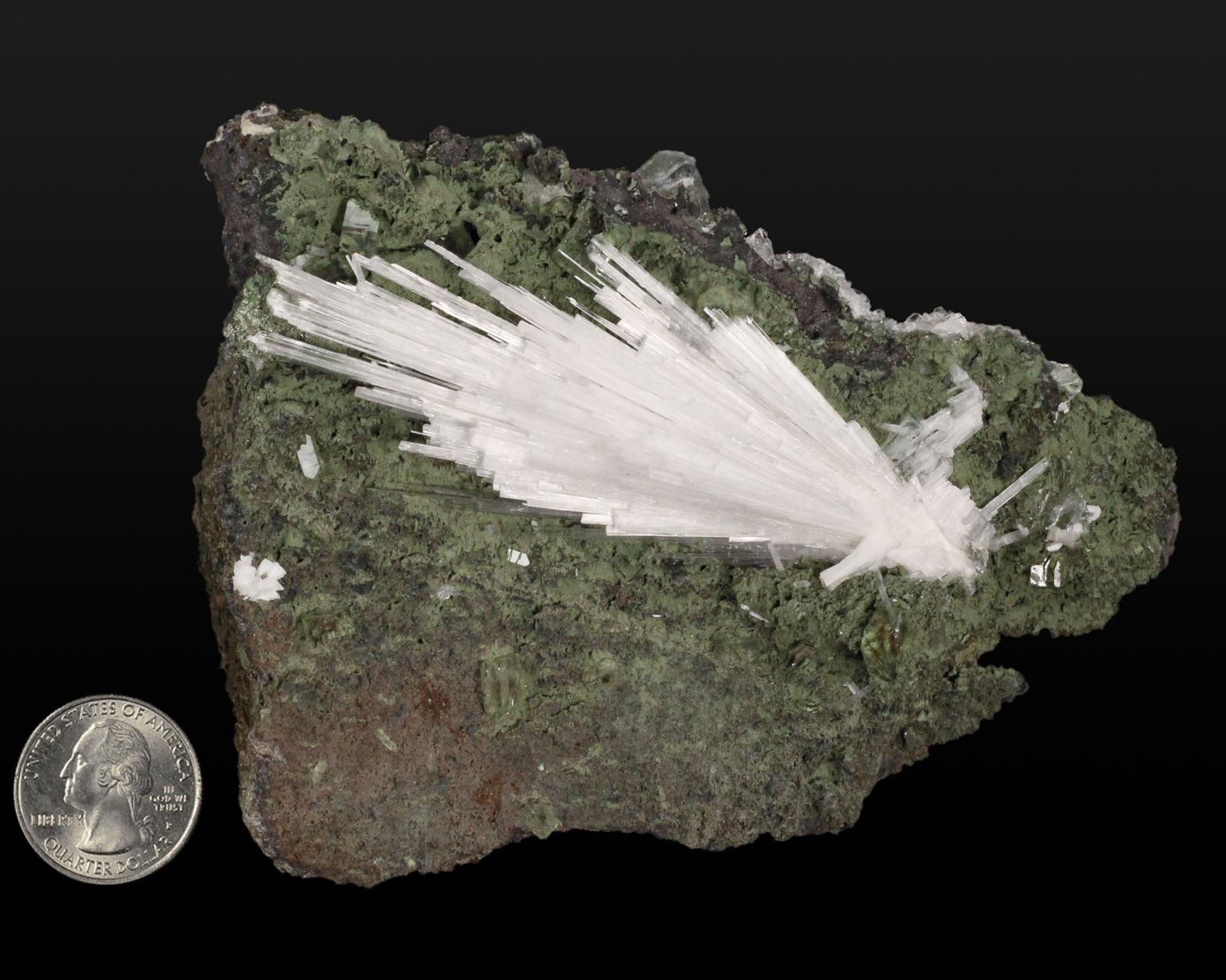 A radial spray of white, transparent to translucent Scolecite on a matrix of Basalt lightly coated with green Celadonite. Nice contrast, crystal formation and symmetry - in excellent condition.