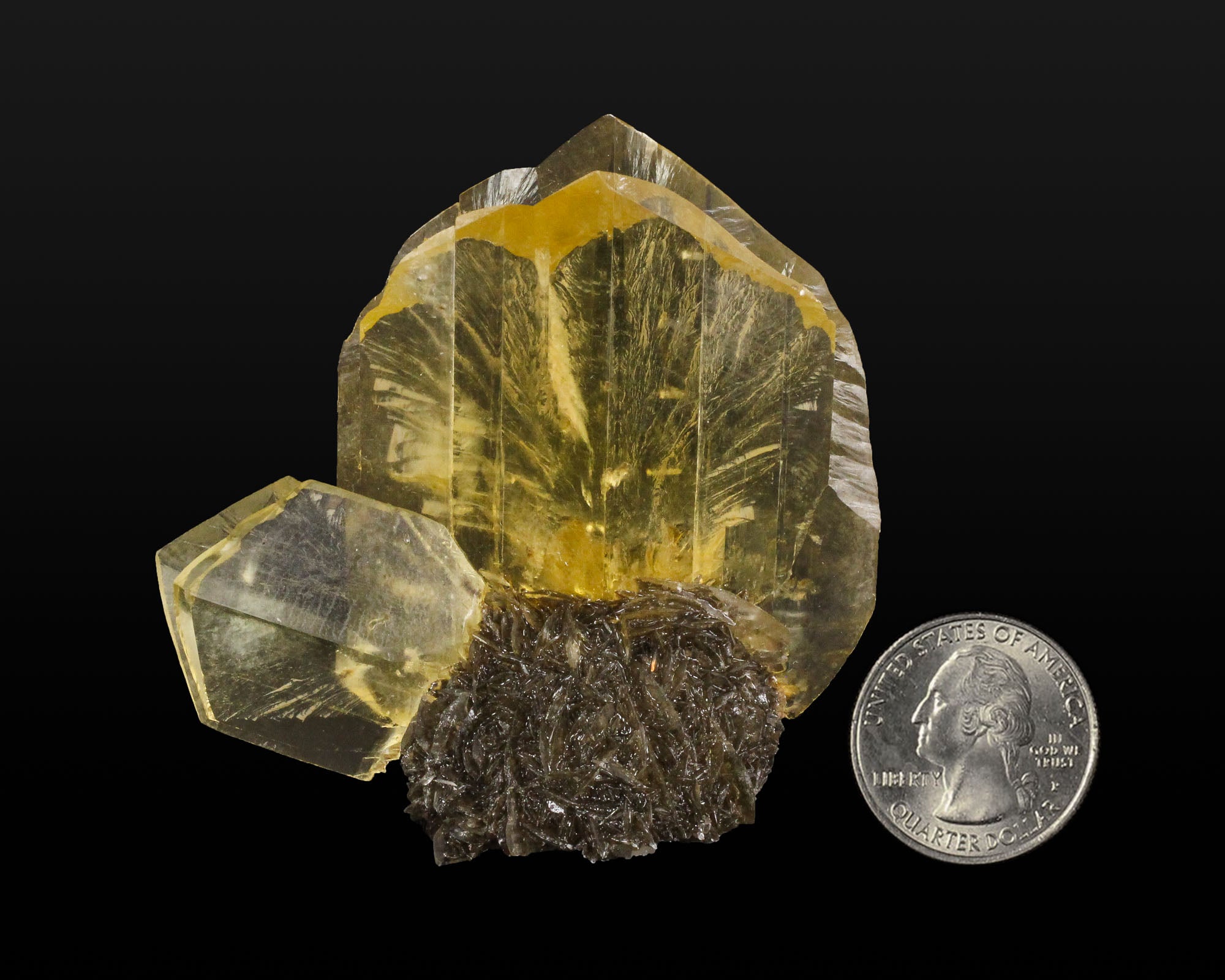 A beautiful specimen featuring two pristine, lustrous, golden Selenite “petals” on a cluster of darker, smaller Selenite crystals. One of the petals is exceptionally large while the matrix is smaller, letting the Selenite easily become the focal point of the piece. A very aesthetic piece that shows incredibly well with great color, luster, crystal formation and contrast. In excellent condition.
