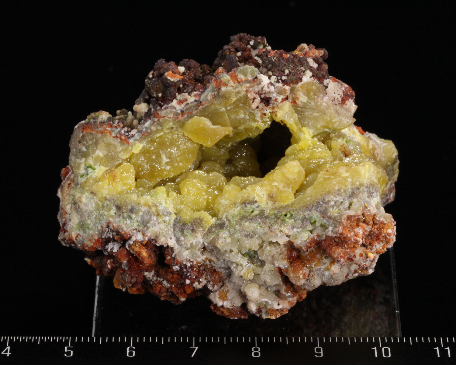 From the famous Tsumeb mine, this large, striking piece features a deep cavity completely lined with deep-yellow, botryoidal Cadmium Smithsonite. The Smithsonite is almost nodular in appearance, and has a classic satin luster. A hard to find color of Smithsonite in excellent condition.