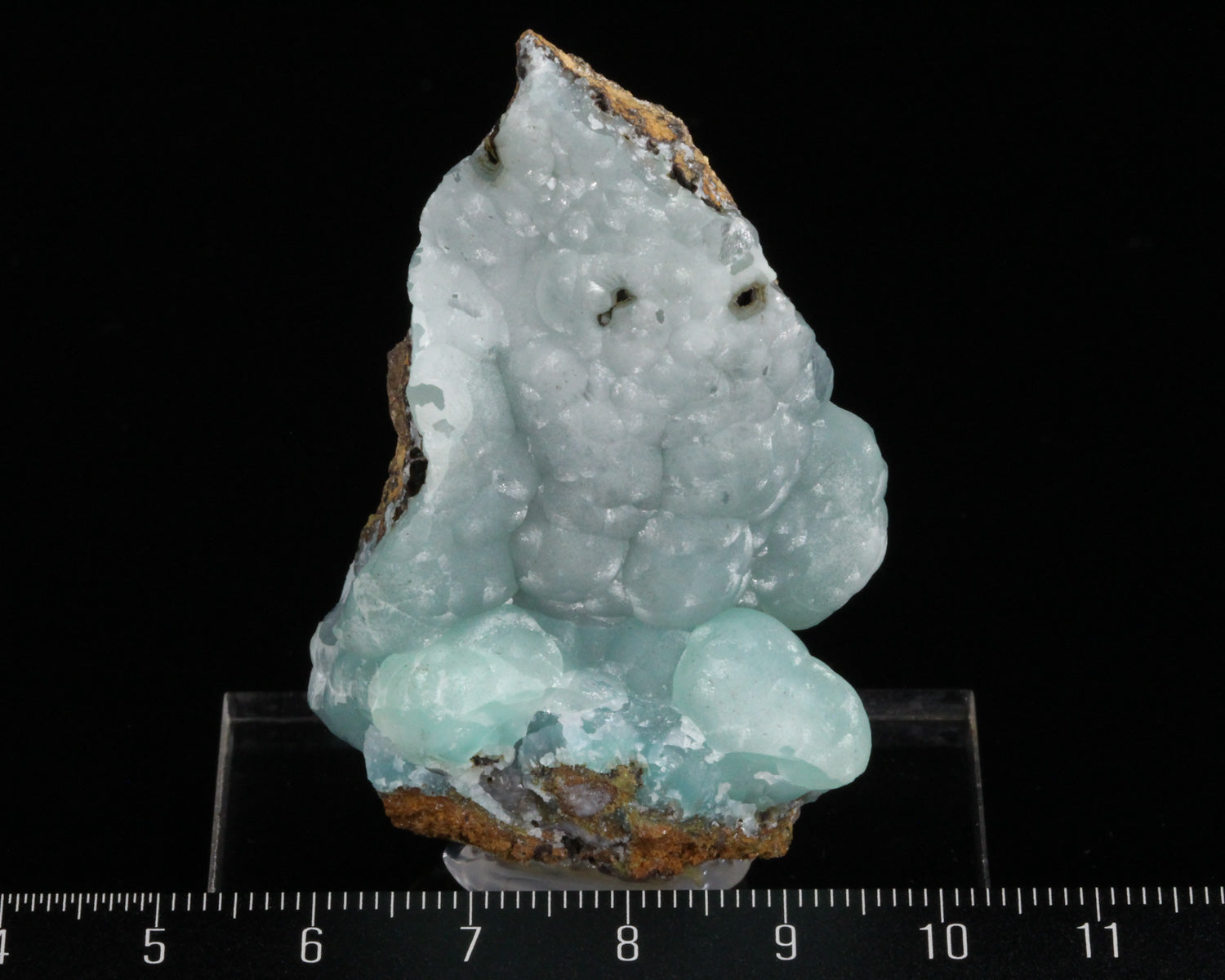 From the famous Tsumeb mine, this eye-catching piece has a flowing botryoidal layer of beautiful teal colored Cuprian Smithsonite on a contrasting brown matrix. What really stands out is the satin luster throughout the piece. A unique and striking piece!