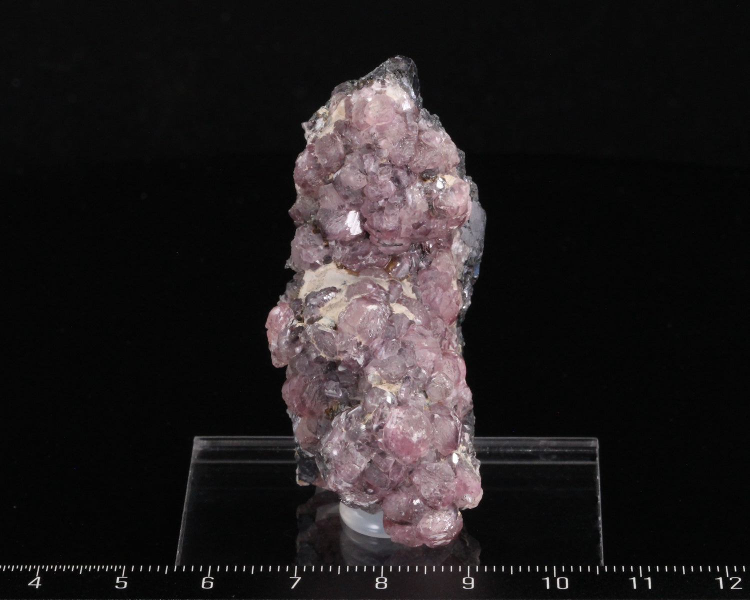From the famous Tsumeb mine, this piece features lustrous, transparent to translucent pink Manganoan Smithsonite crystals on black sulfide matrix. Beautiful piece with amazing luster, color and contrast. In excellent condition.