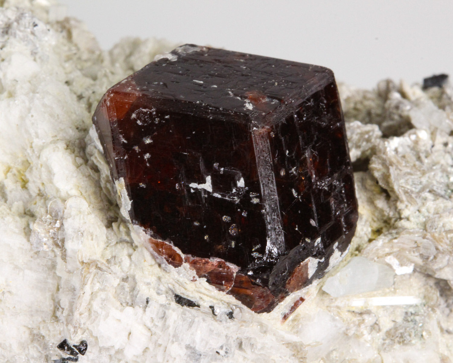 A matrix of white Albite with Schorl Tourmaline and Muscovite hosting an unusually large, complete, lustrous deep wine-red trapezohedral Garnet crystal nicely centered on the matrix. The focal Garnet is whole with clean and smooth faces. A striking piece with great color, crystal formation, symmetry and contrast. In excellent condition.